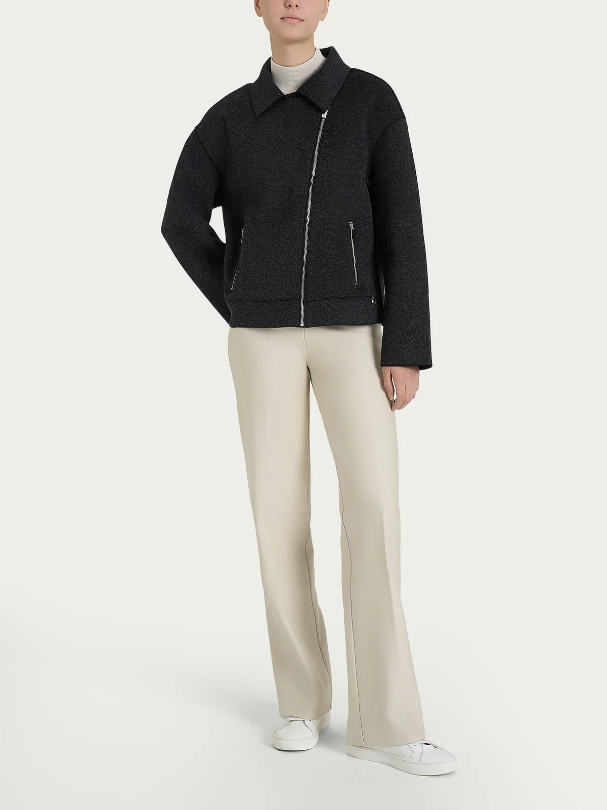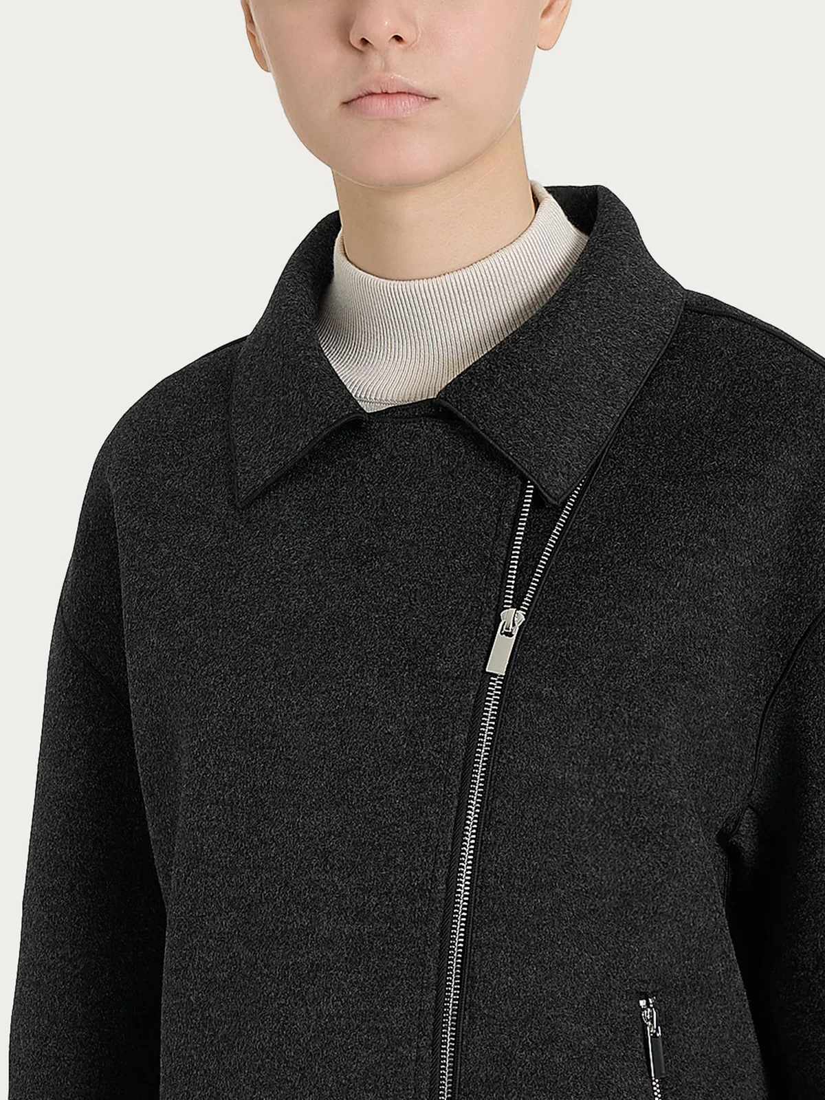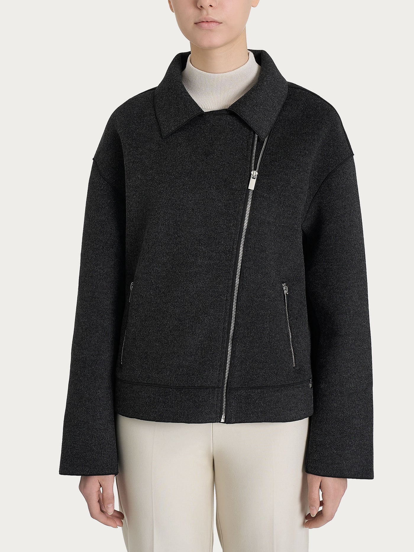 Giacca chiodo da donna in Vegan Wool. E’ un’icona di stile senza tempo, simbolo di carattere e grinta con un tocco moderno. Caratterizzata dalla classica chiusura asimmetrica con zip e collo con revers, dona un look deciso e contemporaneo, perfetto per chi ama distinguersi. Le tasche laterali si chiudono con delle piccole zip per contenere piccoli oggetti e donare massima praticitร . Realizzato in vegan wool, unโalternativa etica alla lana tradizionale, garantisce calore, morbidezza e resistenza, offrendo una texture piacevole al tatto e un look raffinato.