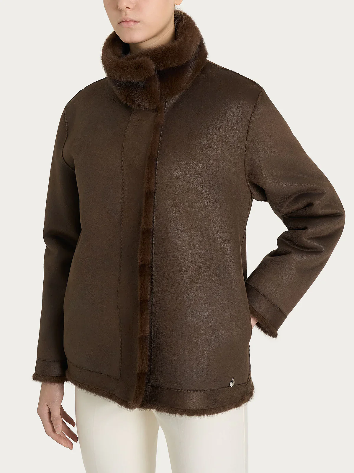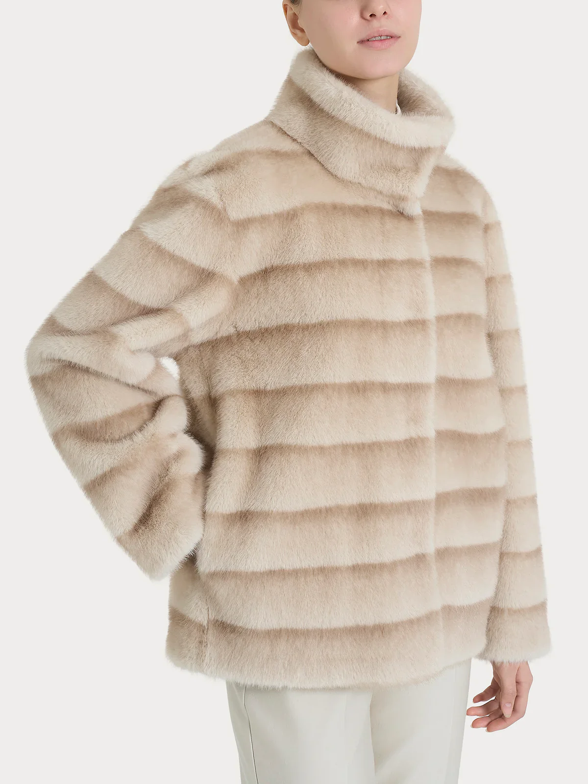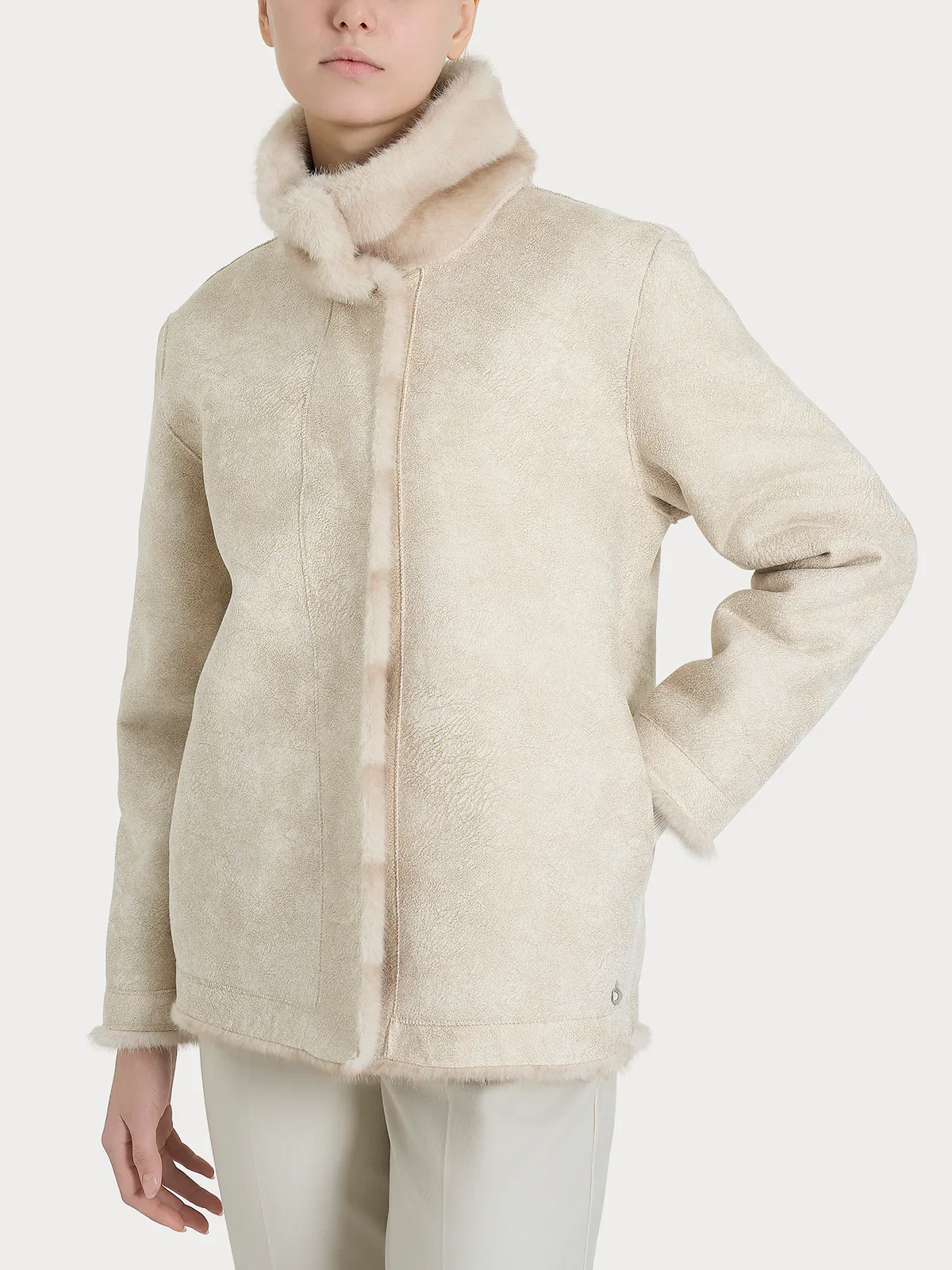 Giacca da donna con chiusura frontale con bottoni a pressione e pratiche tasche laterali. Realizzata in vegan fur, alternativa etica e glamour alla pelliccia tradizionale: soffice, calda e 100% cruelty-free, per vestire con stile e consapevolezza. Morbida e calda, questa giacca si trasforma a seconda del tuo umore o dellโoccasione grazie al suo design double-face. Da un lato si presenta con un effetto pelle scamosciata con delicati profili in pelliccia, ideale per la vita di tutti i giorni o un’uscita informale. Dallโaltro, lasciati avvolgere dalla morbidezza della pelliccia a righe orizzontali tono su tono. Il collo alto ti protegge nelle giornate piรน fredde, mentre la chiusura frontale invisibile mantiene una linea pulita ed elegante. Il taglio comodo e contemporaneo veste alla perfezione senza costringere, accompagnando con classe ogni movimento.