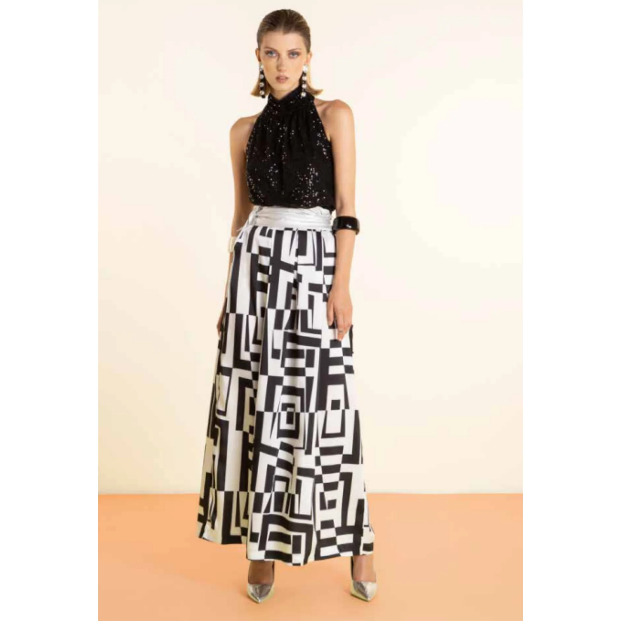 Gonna Manuela Riva lunga in fantasia bianco e nero a vita alta, con vestibilità morbida.