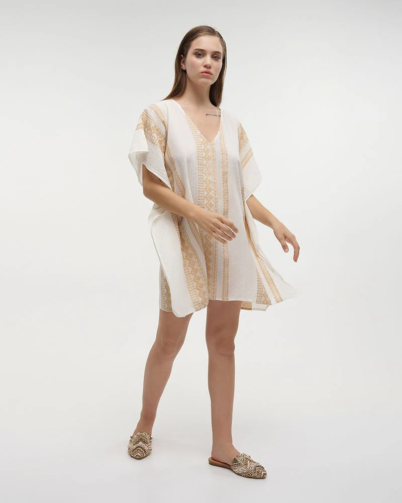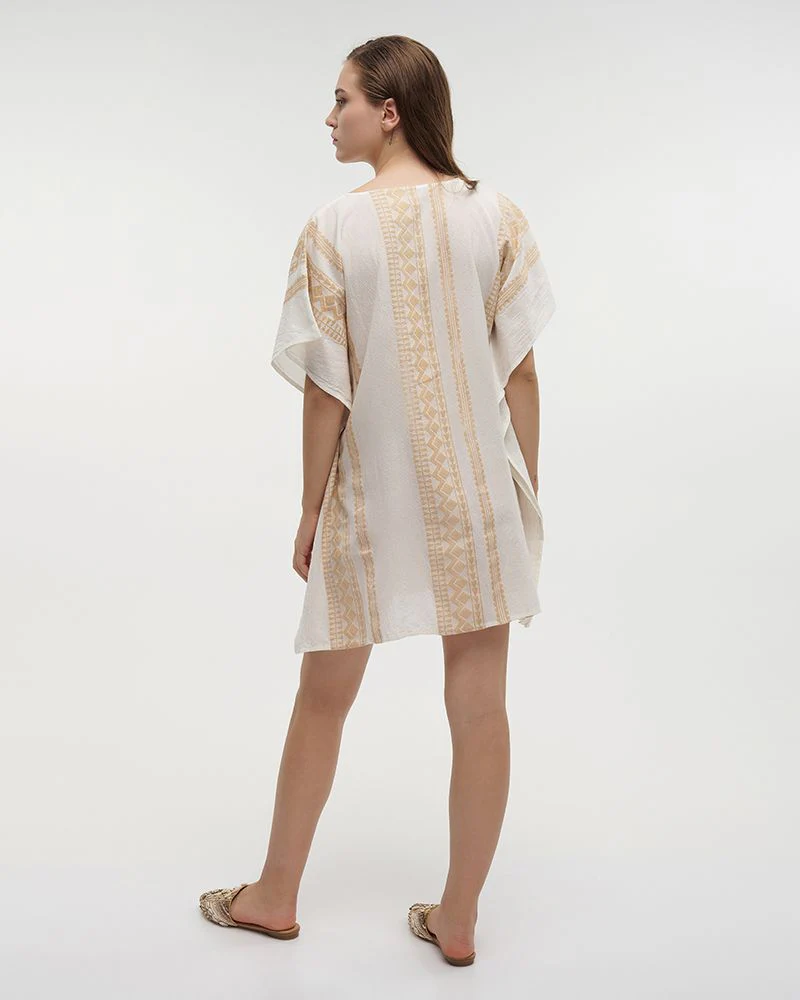 Kaftano donna morbido cotone manica a 3/4, bianco con righe ricamate color salmone per rendere il tutto piรน vivace.