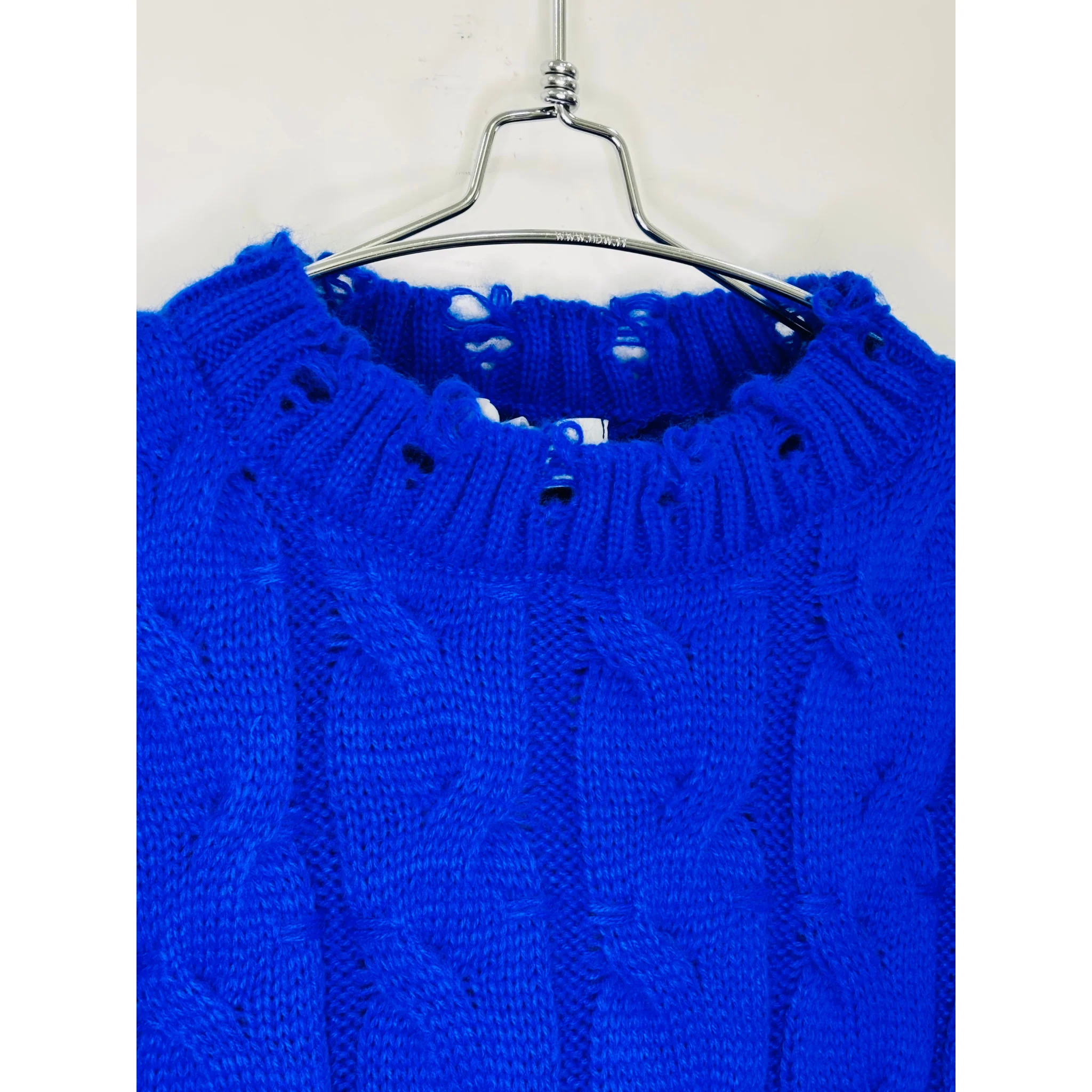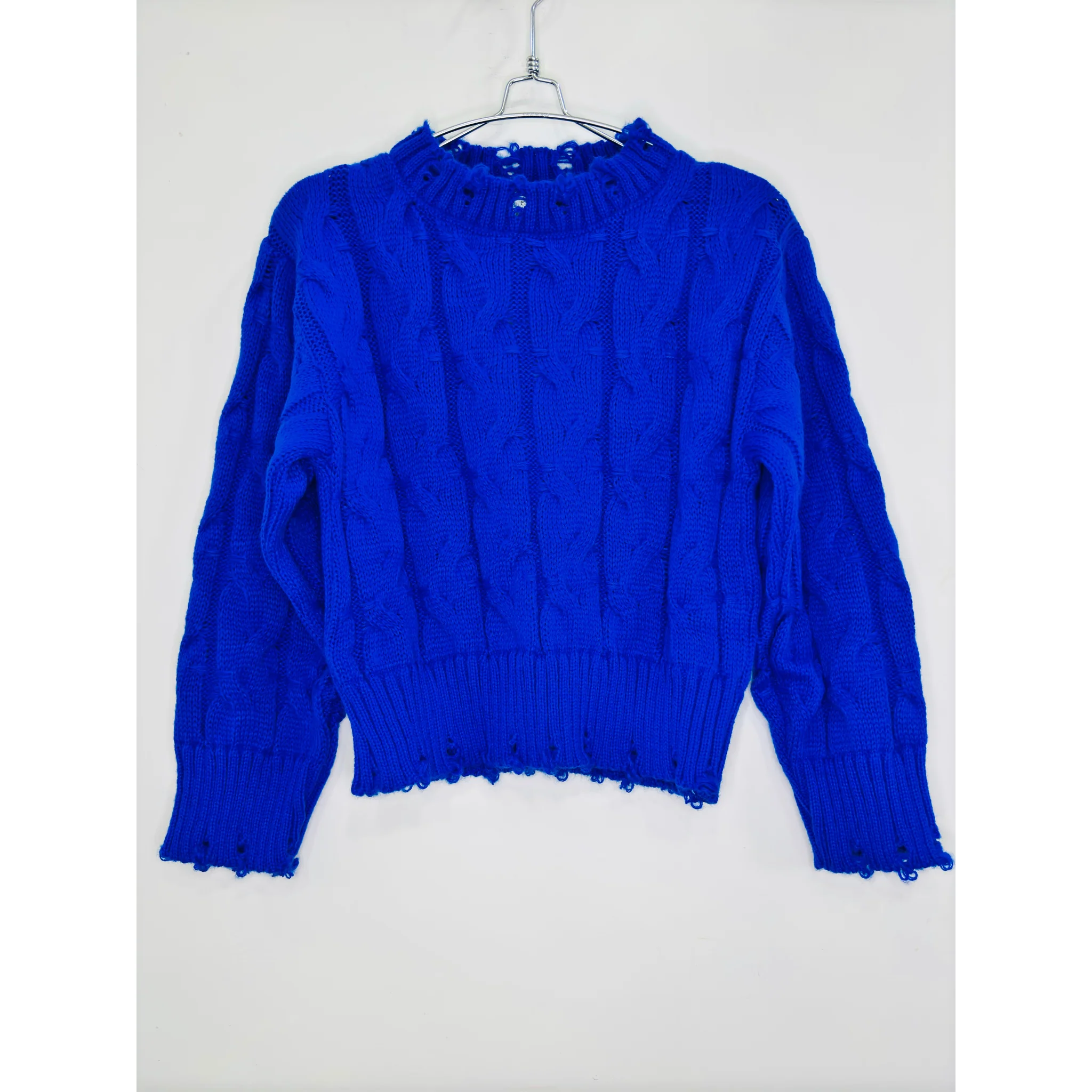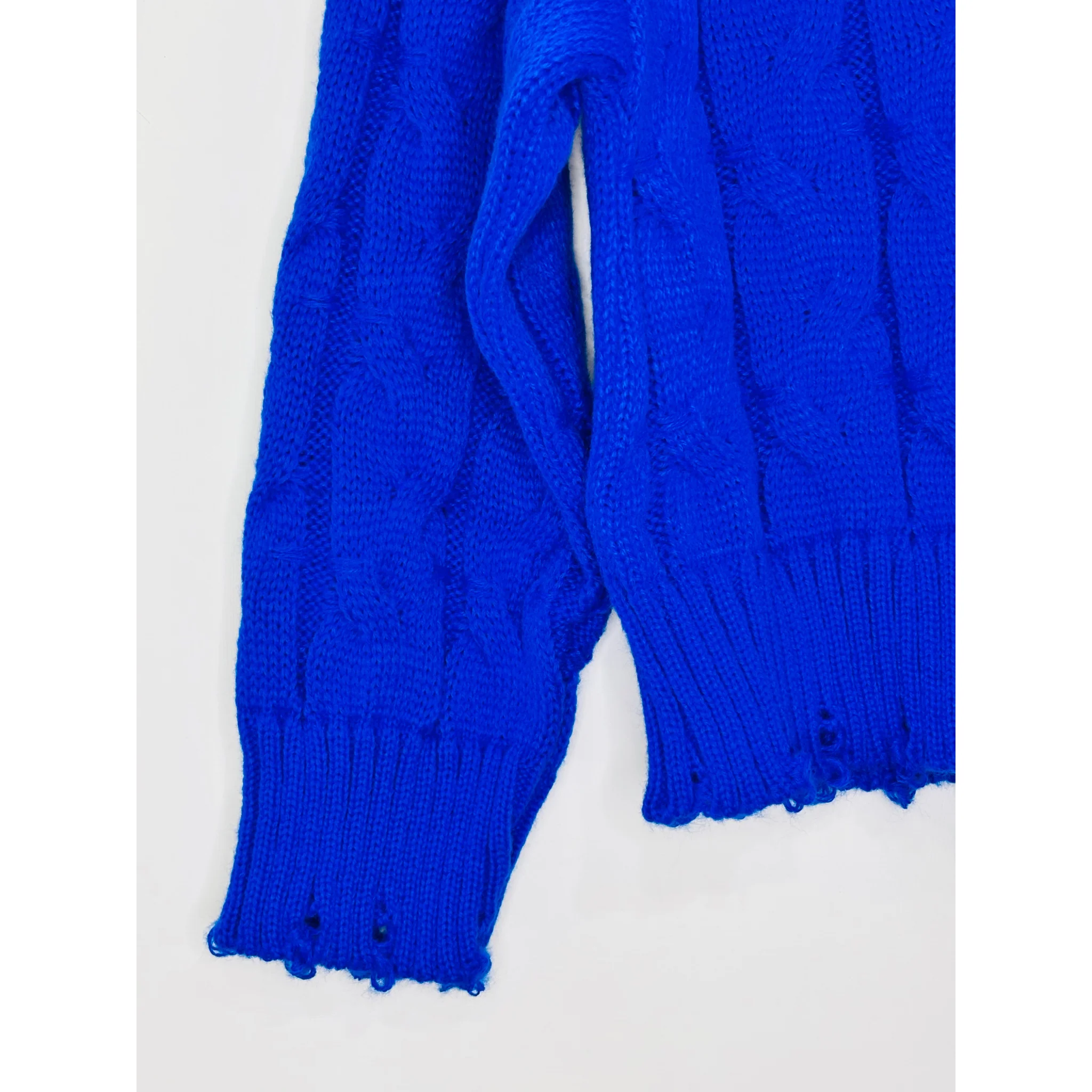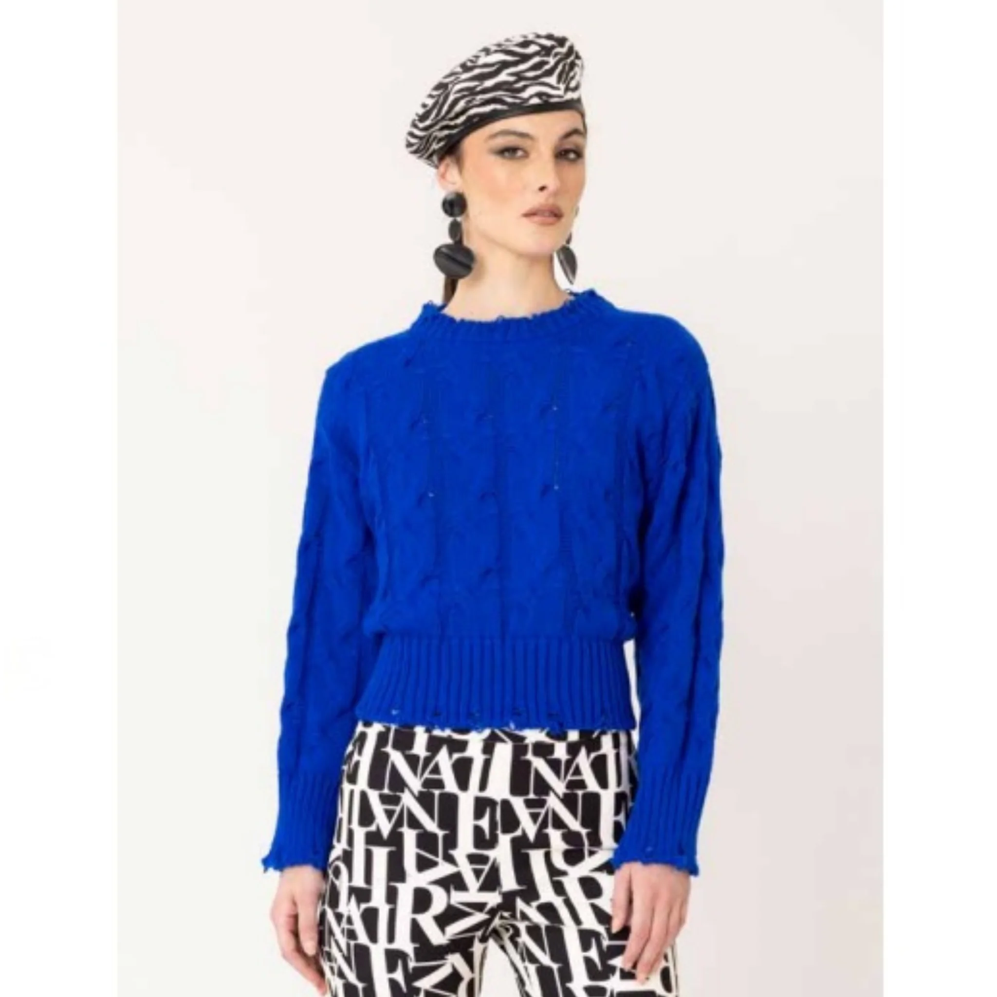 Maglia Manuela Riva presenta un elegante motivo a treccia e uno stile trendy con effetto strappi sui polsi e girocollo. Ideale per un look casual ma sofisticato. Grazie al suo design unico, sarai sempre al passo con le ultime tendenze.