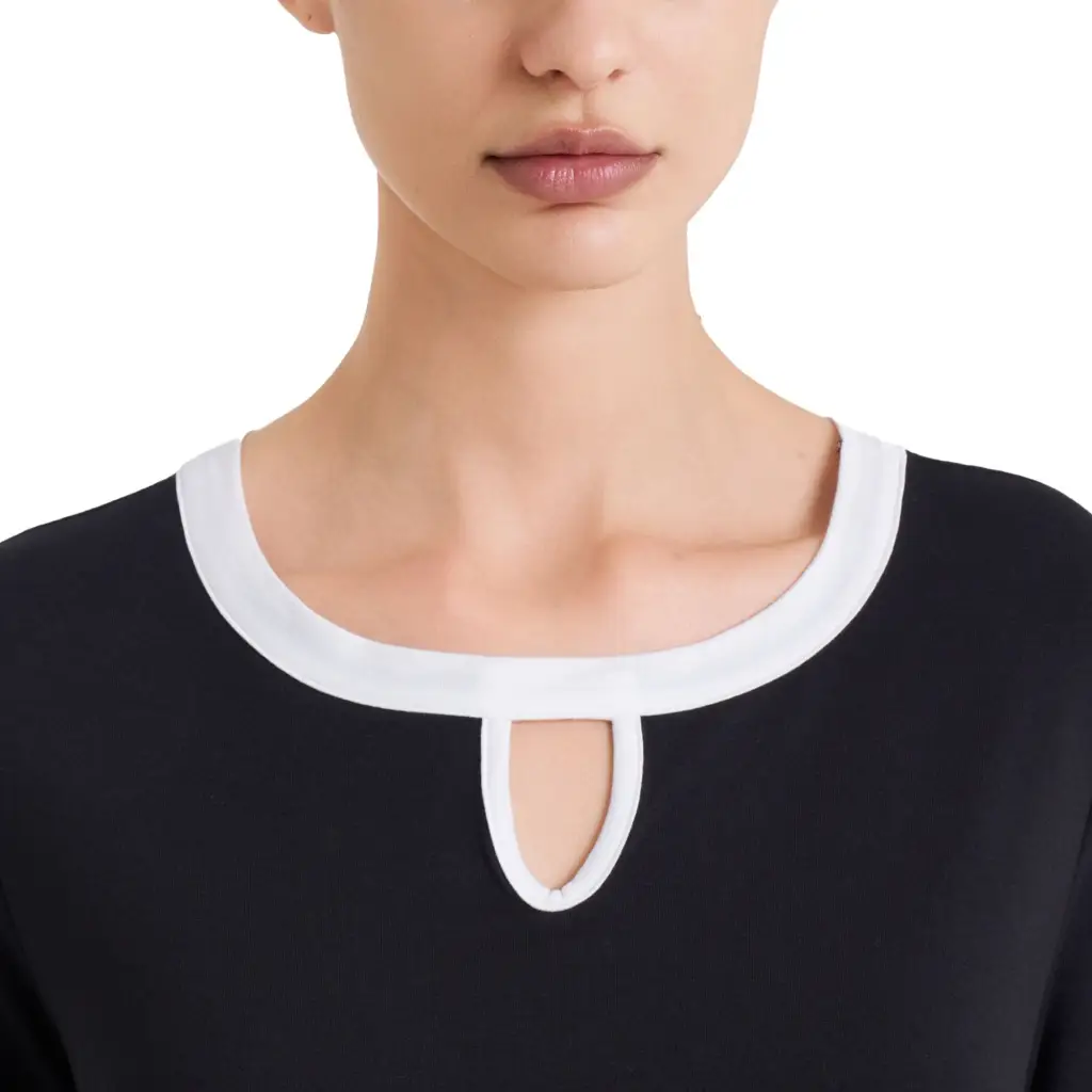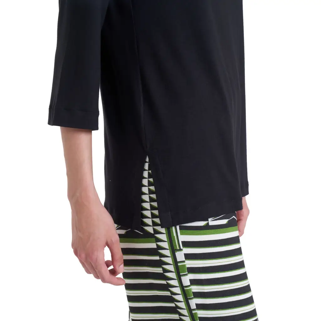 Maglia sottogiacca paricollo con manica a 3/4 in viscosa di Ragno. La linea Ragno si contraddistingue per la cura dei dettagli e l’uso di materie prima di qualità, oltre che per la creazione di collezioni sempre attente alle esigenze delle donne e alle tendenze moda. Dall’aspetto semplice, questa t-shirt è fresca e morbidissima, versatile per la vita di tutti i giorni. Sarà la perfetta alleata per la stagione primaverile ed estiva grazie al modello svasato con spacchetti sui fianchi e al tessuto fresco e leggero. Questa t-shirt si può abbinare facilmente sia ai look più sportivi come a tute o leggins, sia ai look più casual con pantaloni in denim o a fantasia. Il classico ed intramontabile abbinamento Bianco-Nero la rende molto elegante e versatile.