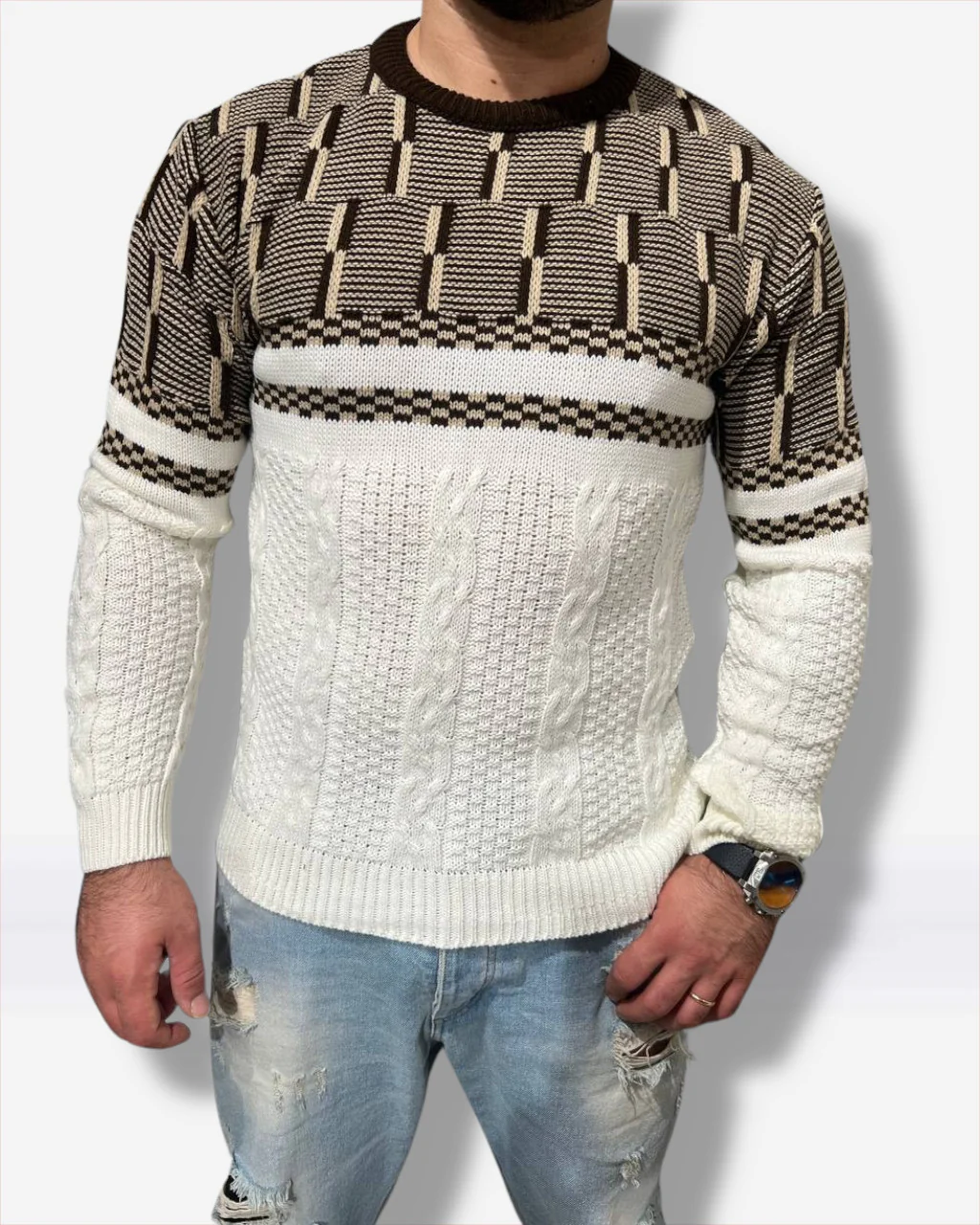 Il Maglione uomo Myden รจ un elegante maglione in maglia con motivo a strisce panna, marrone e beige che offre comfort ed eleganza. Realizzato con una soffice miscela di acrilico e lana, questo maglione offre un comfort ineguagliabile e uno stile ineguagliabile. รˆ quindi il capo perfetto per chi desidera elevare il proprio look. Codice articolo GCP557