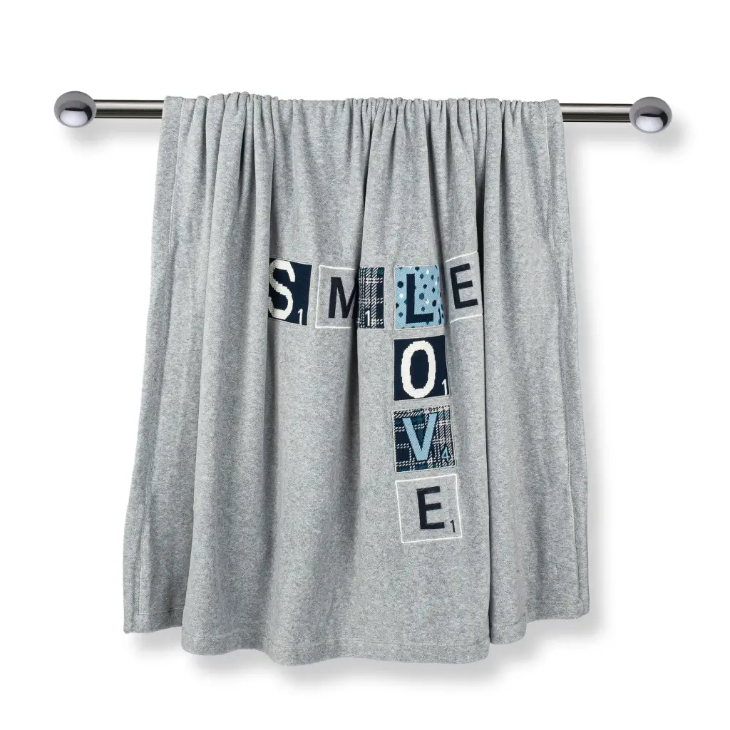 Maxi plaid in pile della linea Smile-Love di MaryPlaid. Questo plaid è molto semplice ma raffinato grazie al colore chiaro del fondo. Il disegno è sobrio e delicato, tutta realizzato sui toni del bianco e dell’azzurro. La fantasia è particolare e tutto realizzato tramite applicazioni e ricami. Il tessuto in pile del plaid è morbido e caldo, con un trattamento antipilling che lo rende durevole, anche dopo molti lavaggi. Grazie al suo design unico può essere utilizzato anche come vero e proprio elemento di arredo per la camera e il soggiorno. Ottima idea regalo per ogni occasione.
