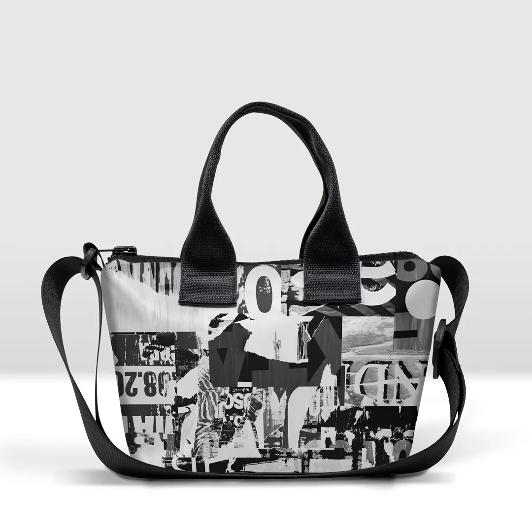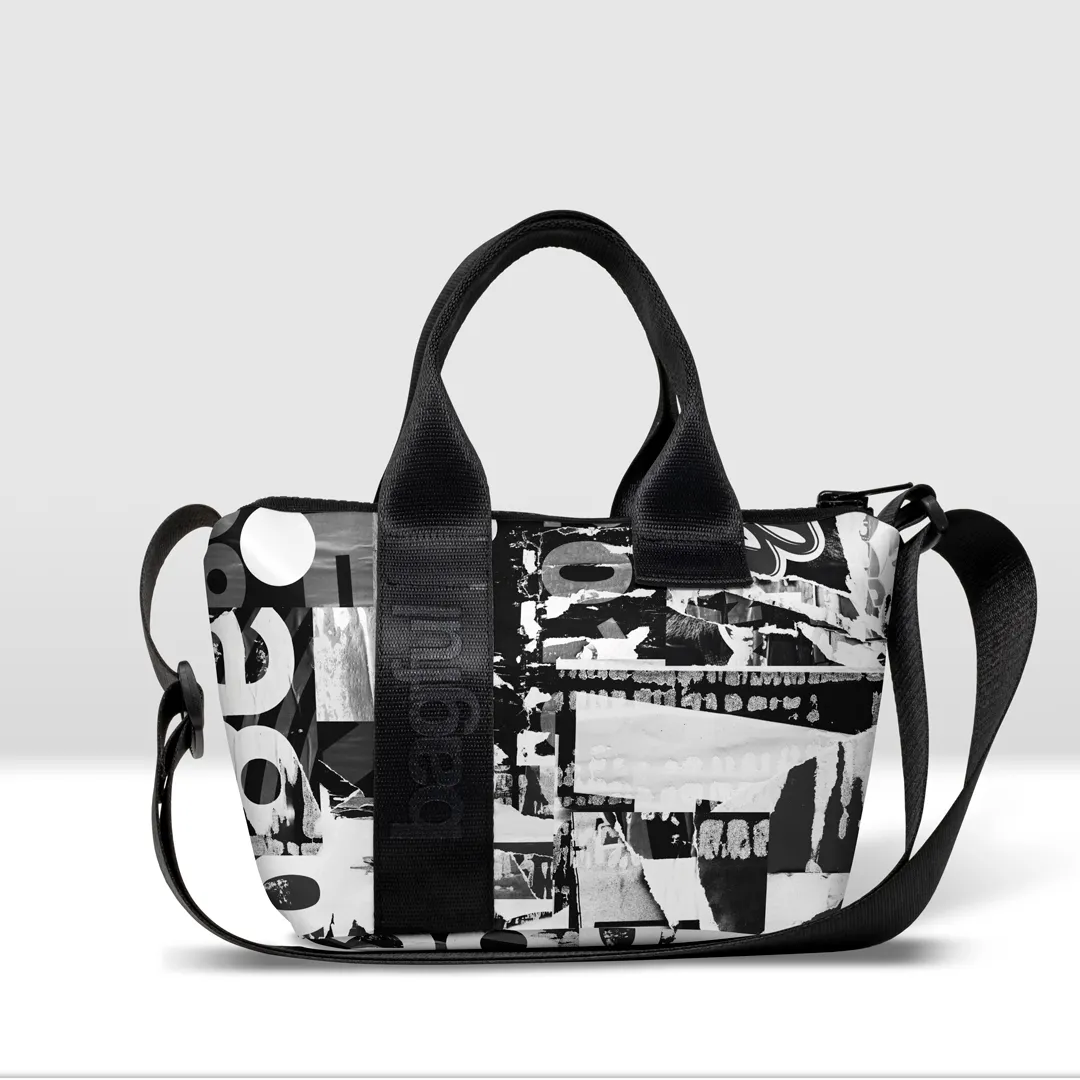 Borsa in banner PVC stampato, zip esterna pressofusa con bordo in tessuto, taschino interno con zip pressofusa, imbottita sul fondo e con possibilità di aggiungere una tracolla. Cinghia prodotta con cintura di sicurezza, brandizzata con incisione laser.