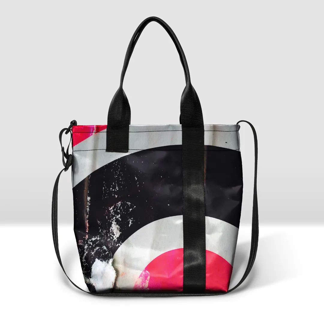 Borsa in banner PVC stampato, con zip pressofusa divisibile e tasca interna.