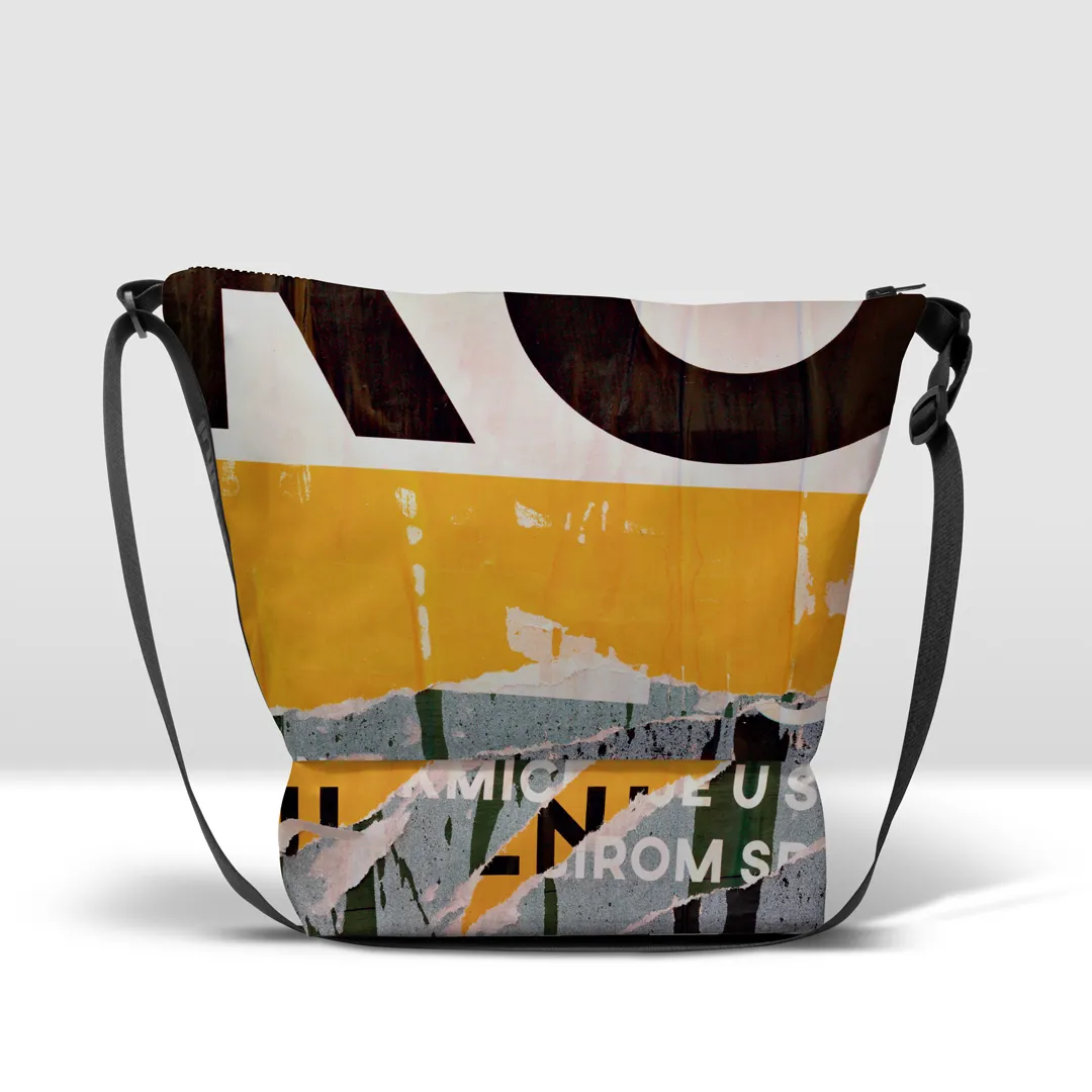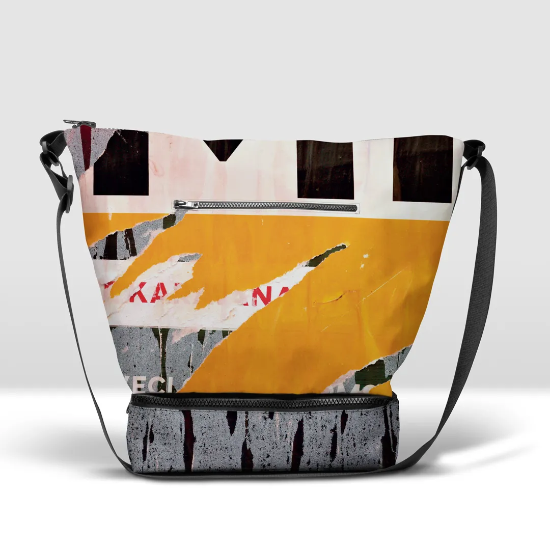 Stampata in banner PVC 560, tasca con zip pressofusa e base capiente separata da cerniera.