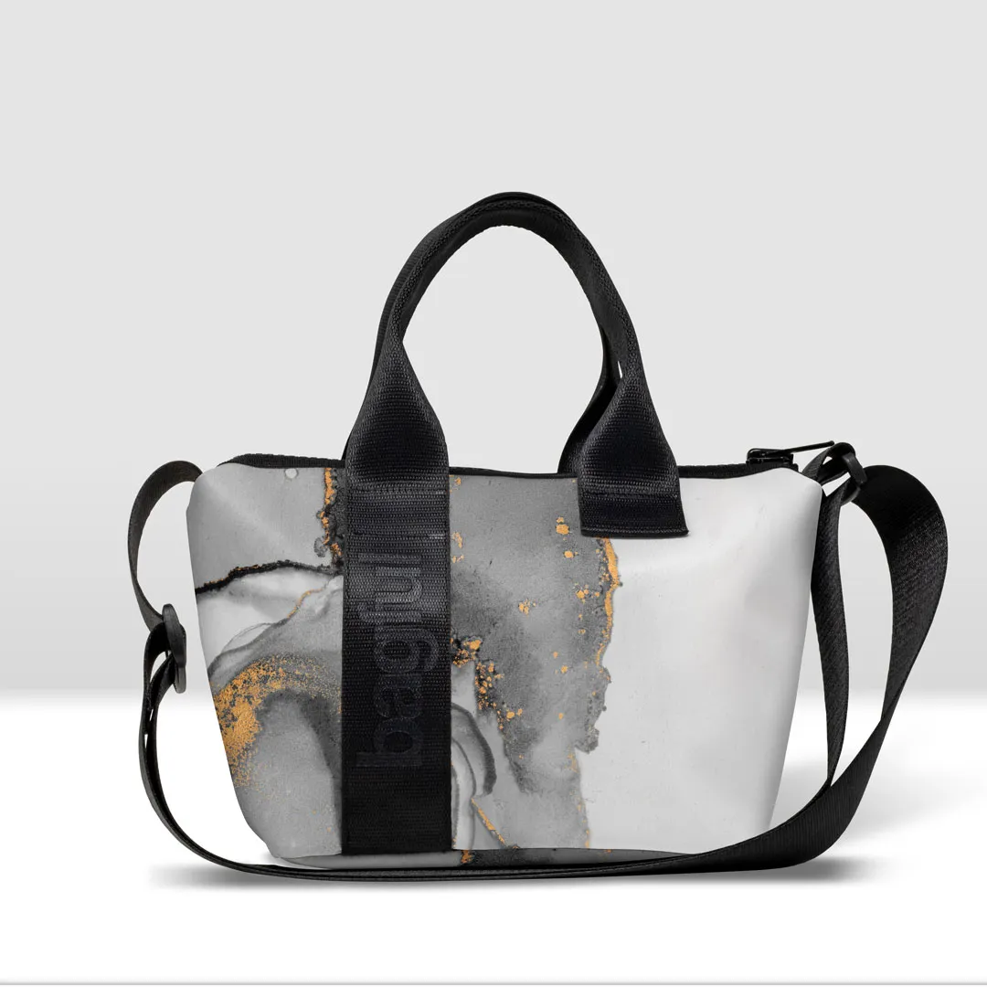 Borsa in banner PVC stampato, zip esterna pressofusa con bordo in tessuto, taschino interno con zip pressofusa, imbottita sul fondo e con possibilità di aggiungere una tracolla. Cinghia prodotta con cintura di sicurezza, brandizzata con incisione laser.