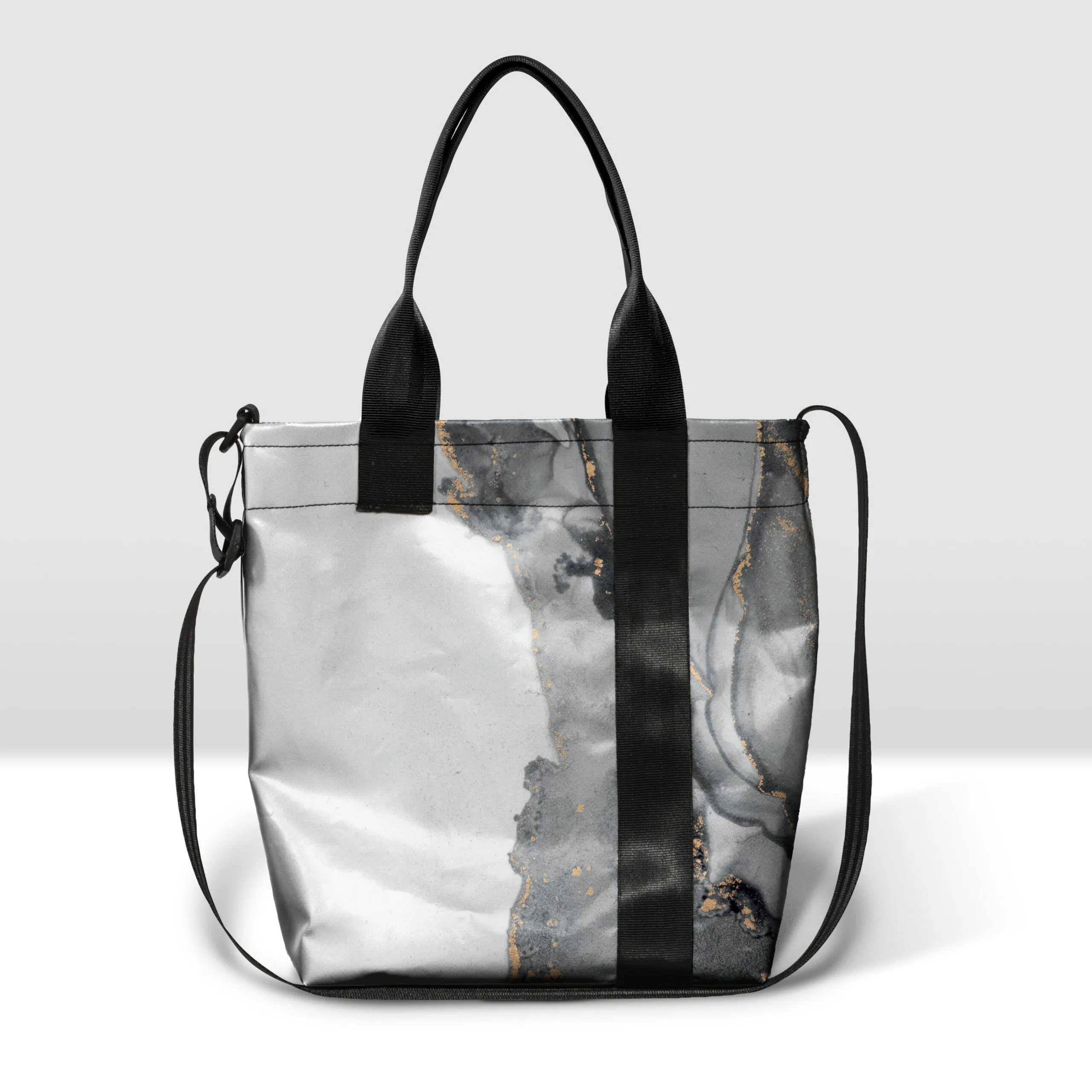 Borsa in banner PVC stampato, con zip pressofusa divisibile e tasca interna.