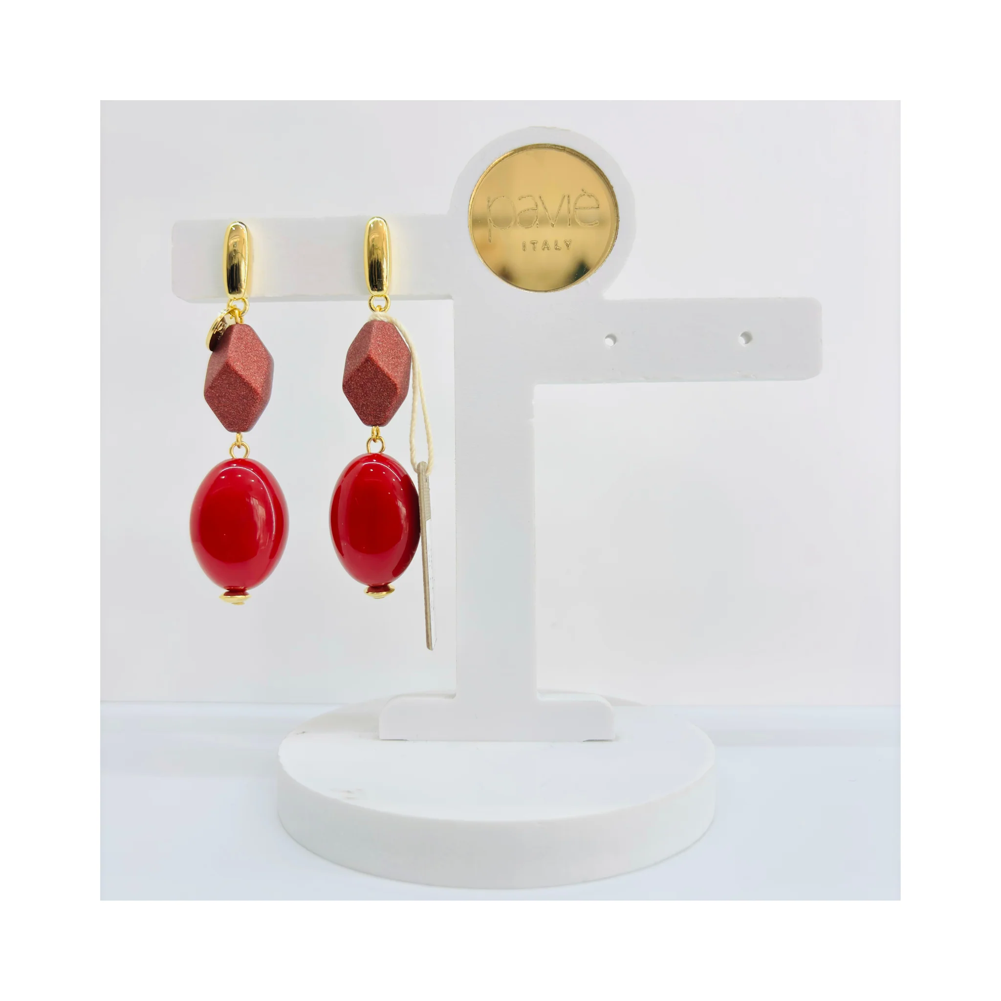 Orecchini Paviè pendenti realizzati in resina matta e lucida e metallo satinato, con una lunghezza di 7cm.