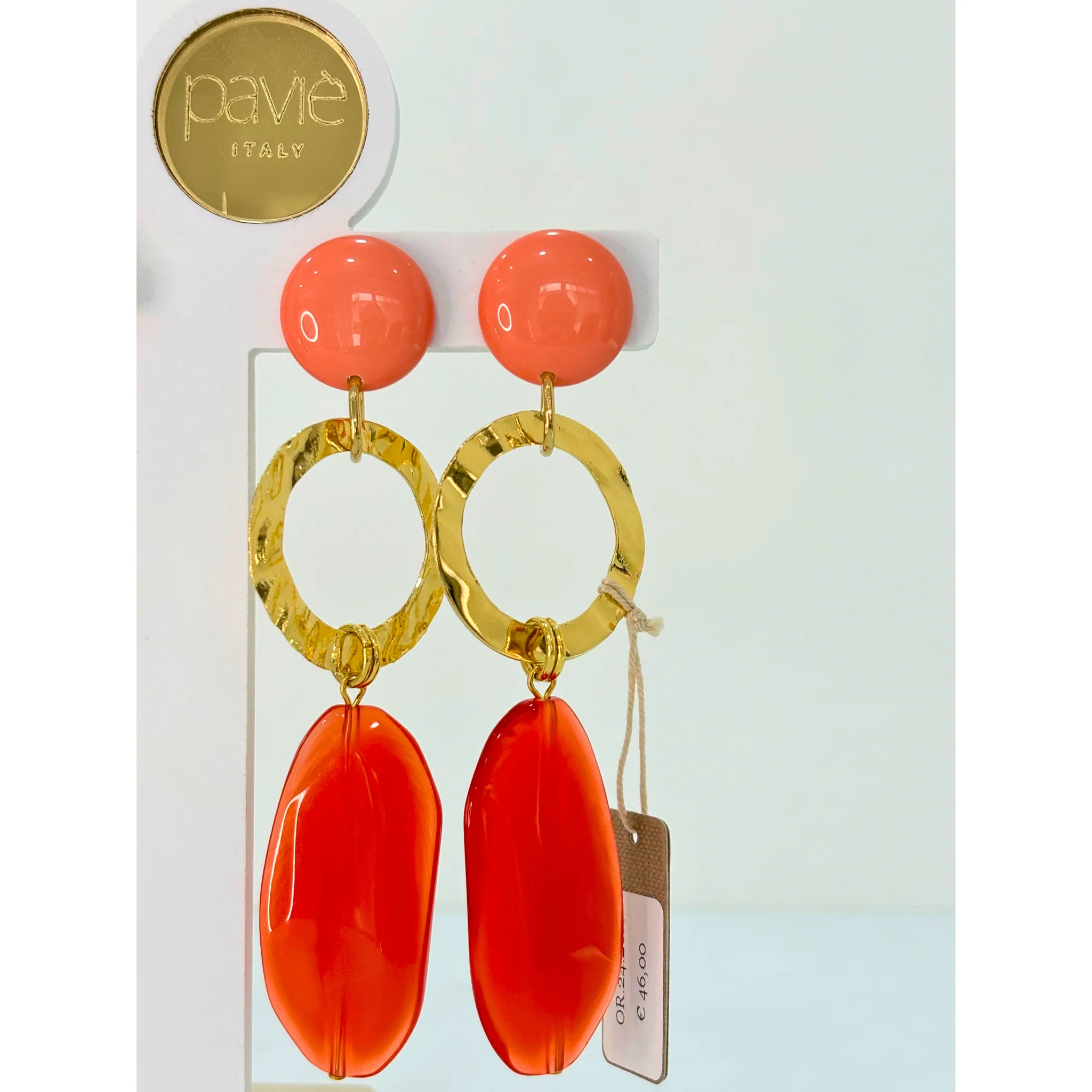 Orecchini pendenti Paviè realizzati con elementi colorati in corallo e oro martellato. Con una lunghezza di 10 cm, questi orecchini eleganti aggiungono un tocco di colore e stile a qualsiasi outfit. Realizzati con materiali di alta qualità, questi orecchini sono perfetti per ogni occasione.