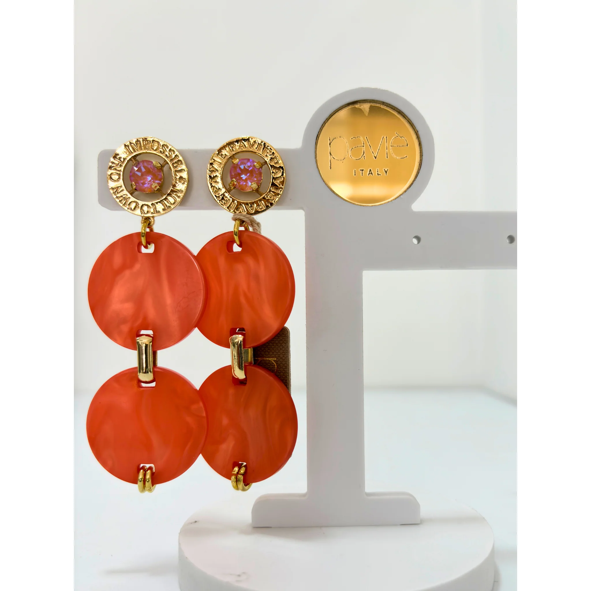 Orecchini pendenti Paviè con resina madreperlata arancio e metallo colore oro sono un’aggiunta elegante al tuo look. La resina madreperlata aggiunge un tocco di colore e lucentezza ai tuoi outfit, mentre il metallo dorato dona un tocco di classe. Perfetti per ogni occasione.