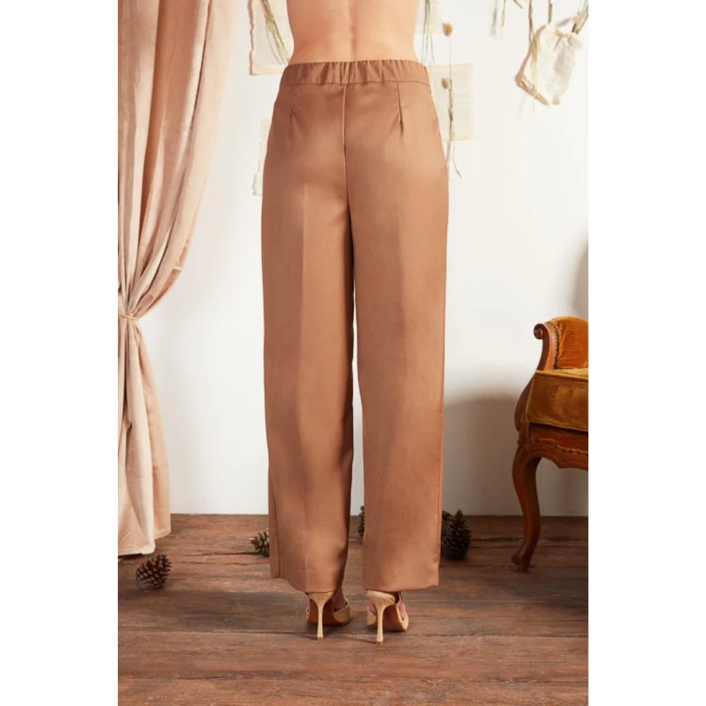 Pantaloni Anima Gemella con elastico in vita e tasche laterali, color cammello.
