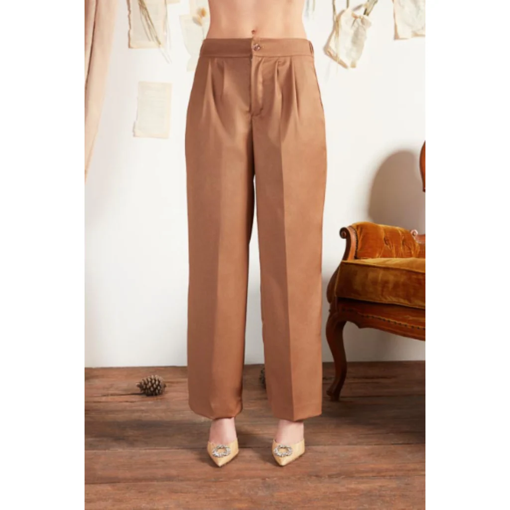 Pantaloni Anima Gemella con elastico in vita e tasche laterali, color cammello. Composizione 65% poliestere 32% viscosa 3% elastene