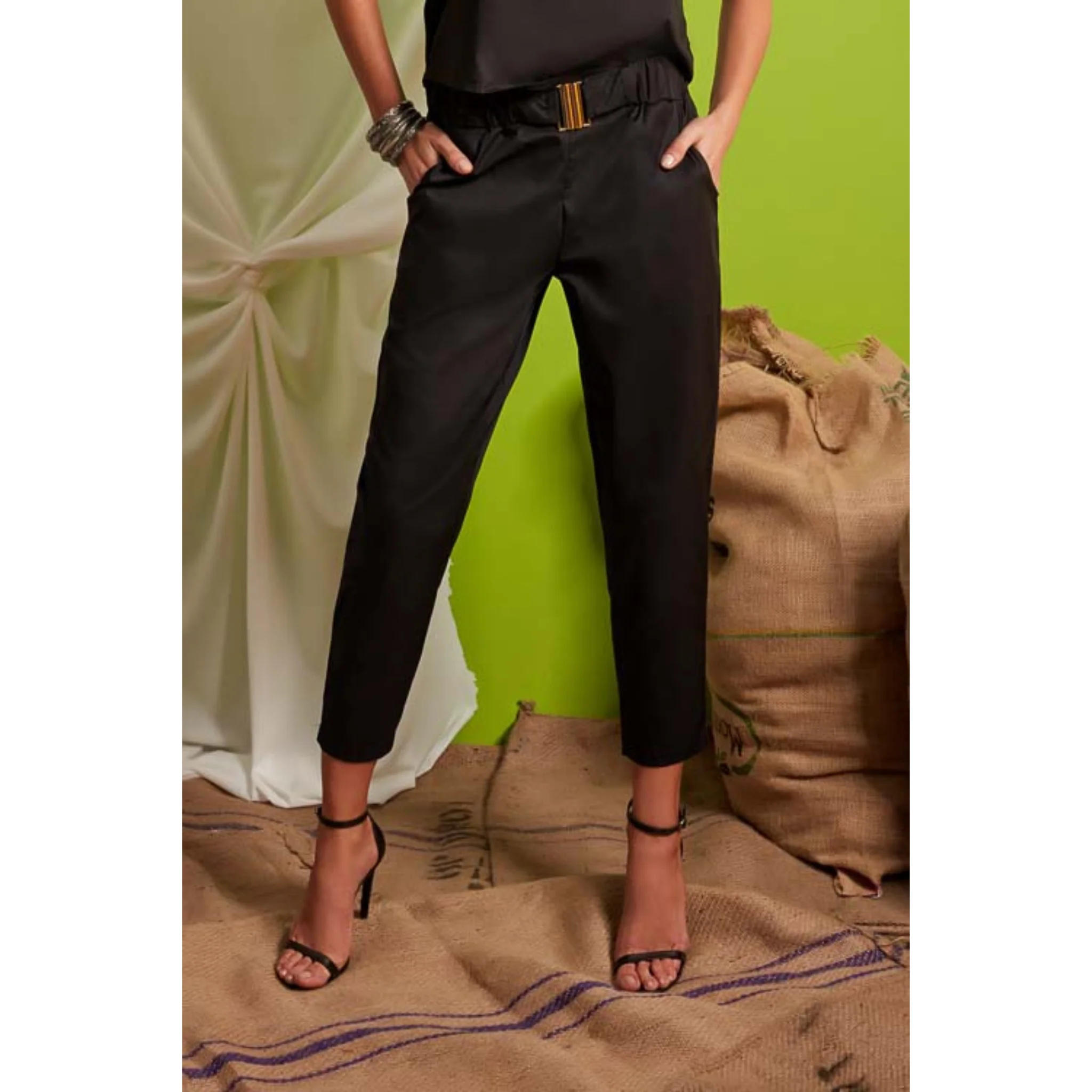 Pantaloni Anima Gemella con elastico e cintura dorata inclusa.