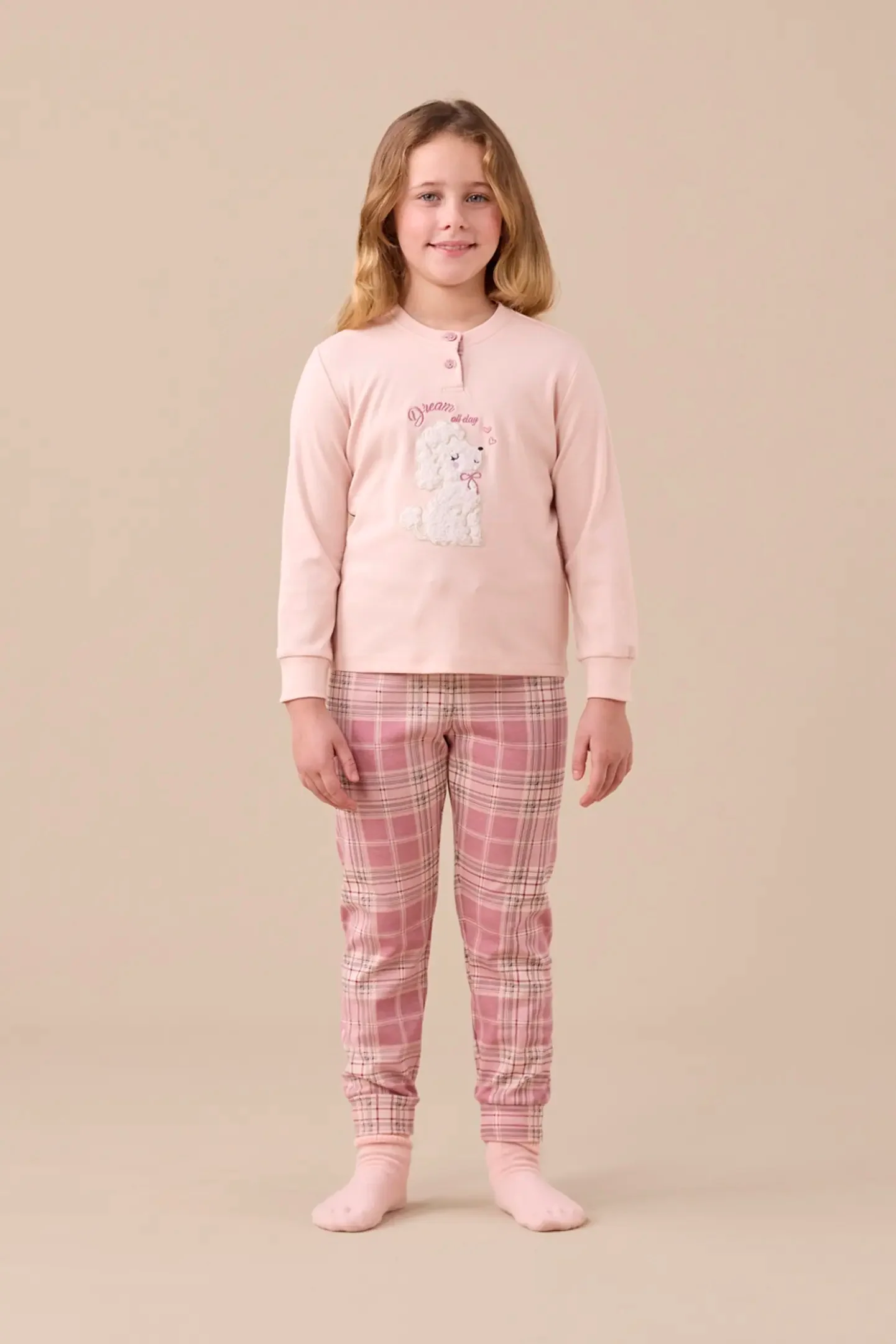 Pigiama bambina in caldo cotone con top unito con due bottoni e barboncino applicato. Pantaloni con stampa scozzese e polsini.