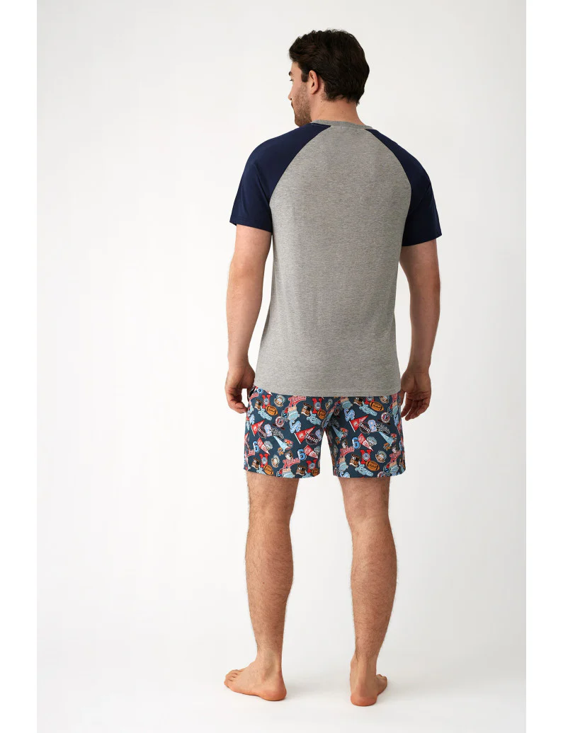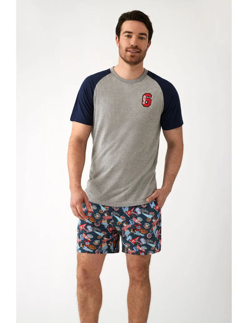 Pigiama a maniche corte con maglietta in 100% cotone, maniche blu navy abbinate a un corpo in grigio mรจlange, abbinato a pantaloncini corti con stampe sportive.