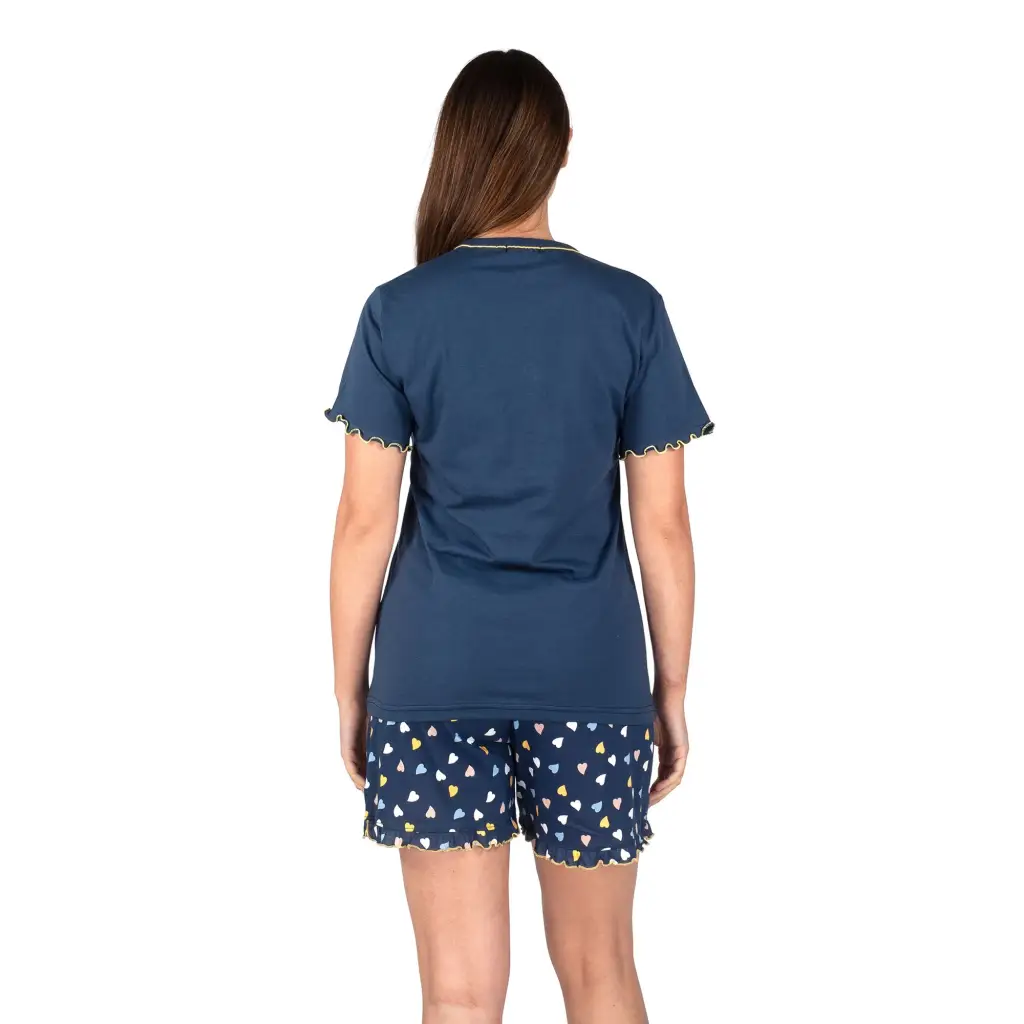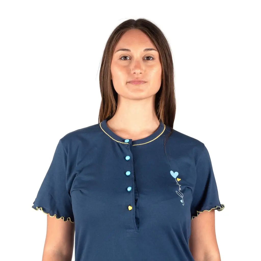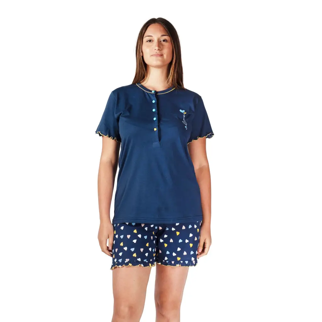 Pigiama a serafino a mezza manica con pantaloncino corto in cotone leggero della linea Love di MariottiLab. Grazie alla qualità del cotone utilizzato e prodotto in Italia, questo modello si presenta fresco e leggero. La t-shirt è molto morbida e con le maniche bordate in contrasto di colore. Il pantalone, con una fantasia di cuoricini colorati sul fondo blu, come la t-shirt che ha i bottoncini in contrasto di colore. Adatto alle calde serate estive e primaverili, questo pigiama risulta dinamico, comodo e molto versatile al punto da poter essere utilizzato anche come completo da casa.