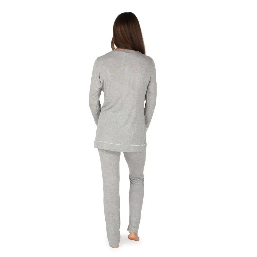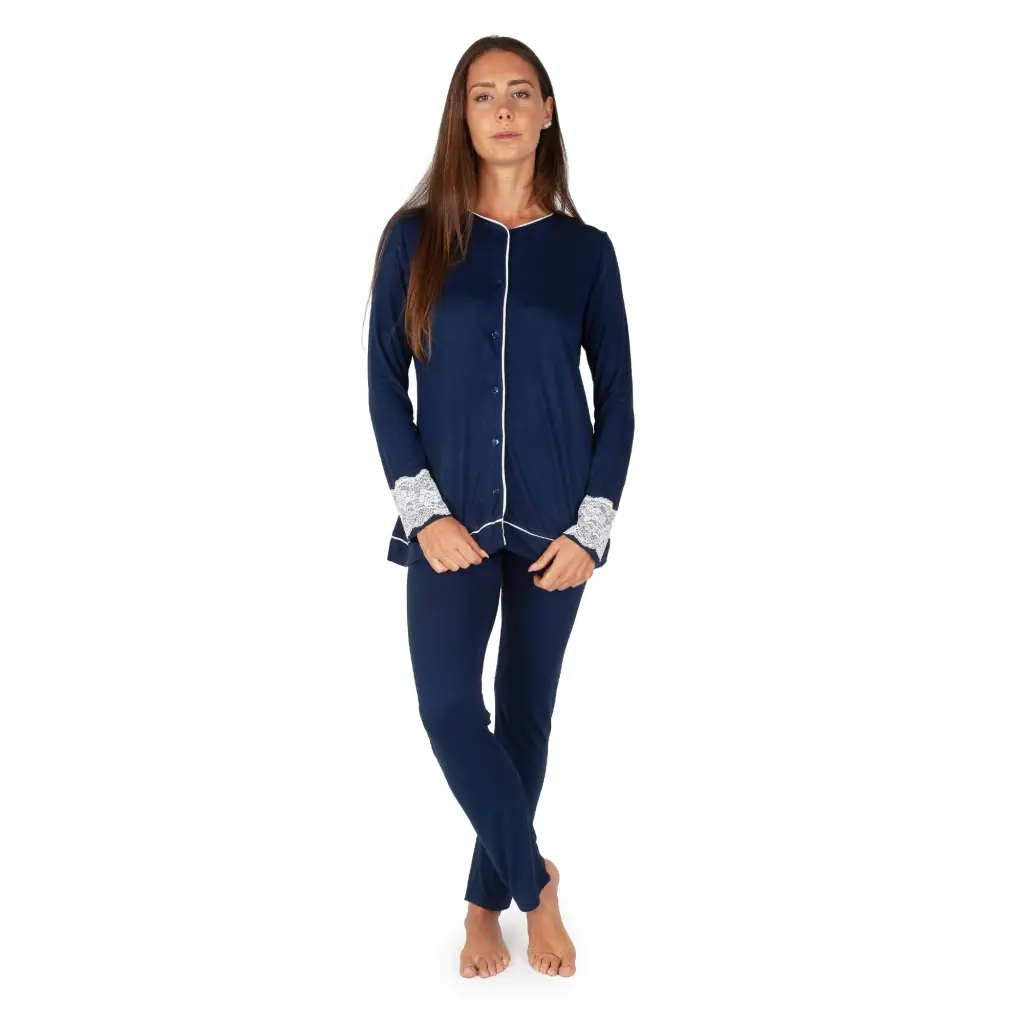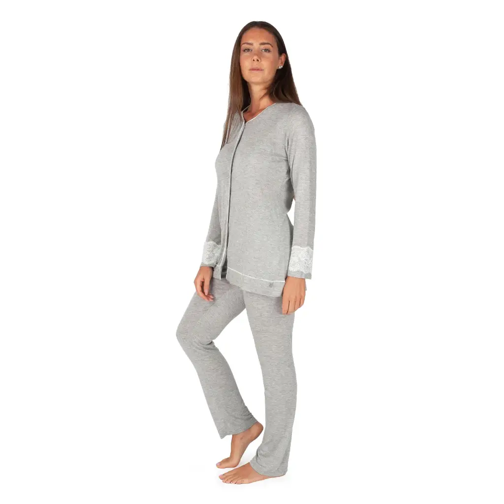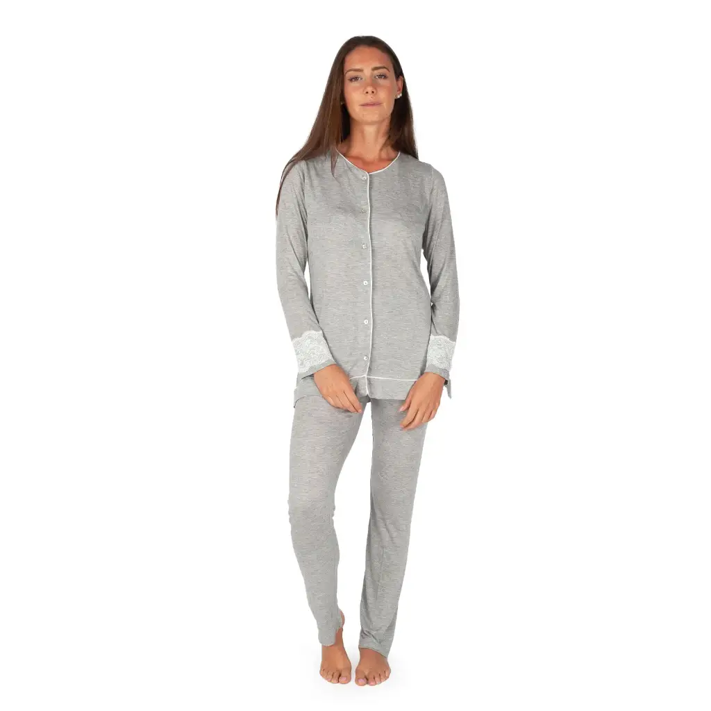 Pigiama aperto davanti in viscosa a tinta unita di MaryHome. Questo pigiama è molto elegante e raffinato. Interamente realizzato nei toni del grigio o del blu con rifiniture in bianco a contrasto, è morbido e confortevole per conciliare il riposo notturno. Il modello ha l’apertura frontale in modo da essere anche funzionale. Questo modello è reso romantico e femminile dal pizzo alla manica.