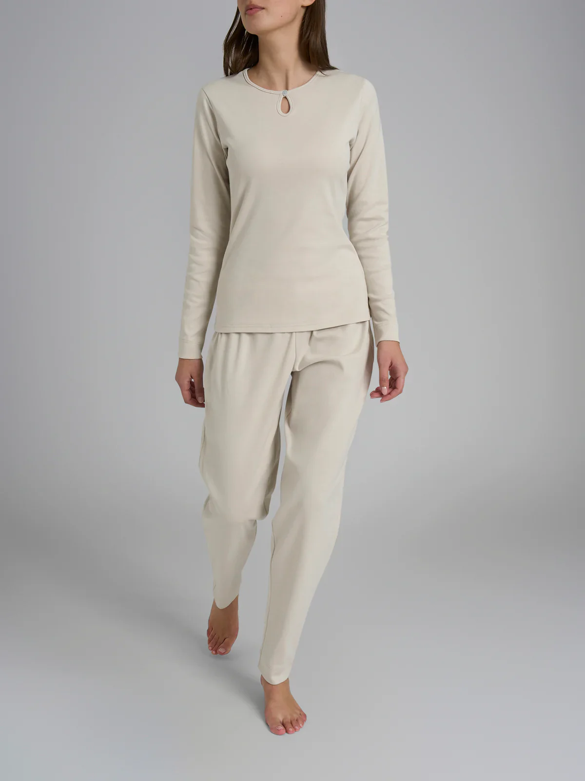 Pigiama donna con manica lunga con scollo serafino e pantalone lungo con polsino. Tessuto in cotone interlook CODICE DR94NU
