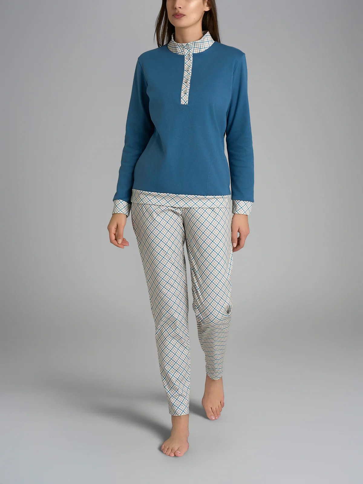 Composto da una casacca tinta unita a manica lunga con scollo a serafino con cinque bottoni e lupetto per un maggiore calore e confort notturno. La bordatura, i polsini ed il collo richiamano la medesima fantasia check presente sul pantalone. Nella parte laterale sono presenti pratiche tasche a filetto per contenere oggetti.