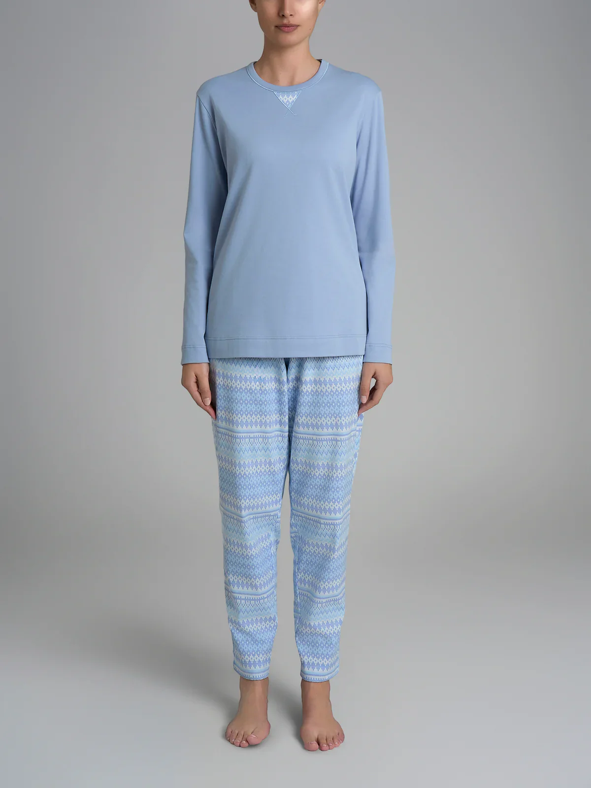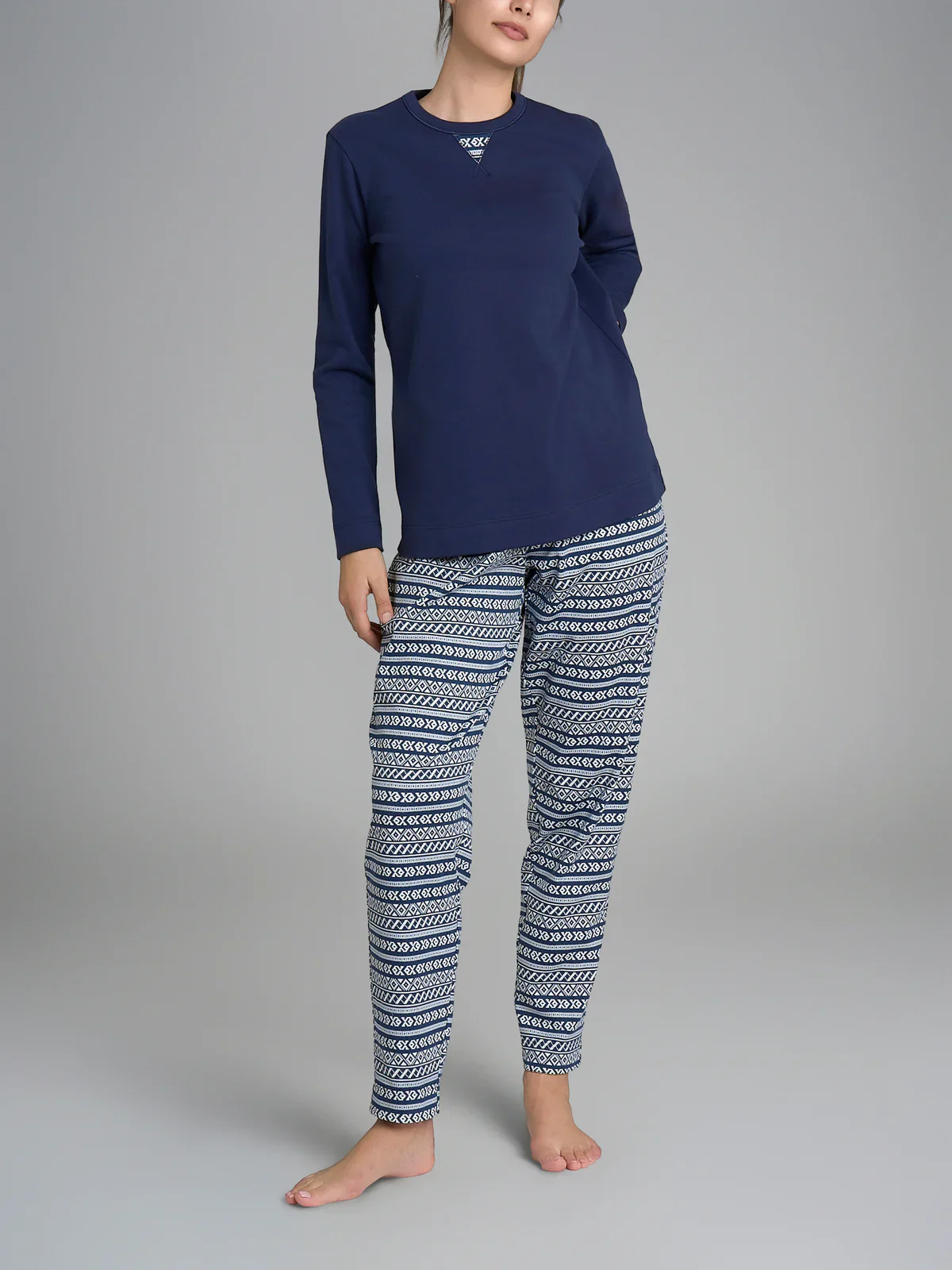 La casacca a girocollo, manica lunga e pratici polsini รจ presentata in una tinta unita classica, ma impreziosita da un dettaglio sul collo. Si tratta di un triangolino che impreziosisce il decoltรฉ richiamando la fantasia presente sui pantaloni. Il pantalone lungo presenta una stampa geometrica all-over che varia a seconda del colore, conferendo un tocco di stile distintivo e rendendo il pigiama unico e originale. Realizzato in caldo cotone interlock, questo pigiama garantisce una piacevole sensazione di morbidezza e calore. Grazie alla sua vestibilitร morbida e comoda, il pigiama รจ ideale per una notte di sonno e di relax.