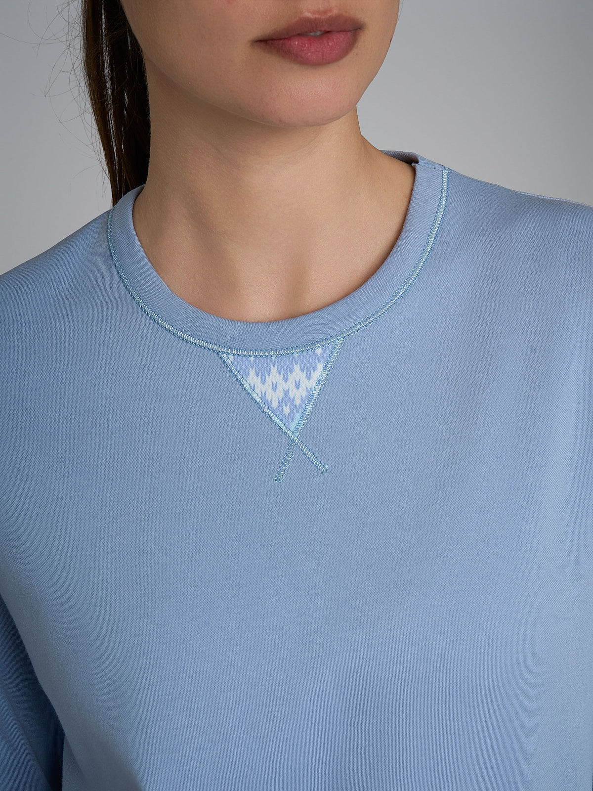 La casacca a girocollo, manica lunga e pratici polsini รจ presentata in una tinta unita classica, ma impreziosita da un dettaglio sul collo. Si tratta di un triangolino che impreziosisce il decoltรฉ richiamando la fantasia presente sui pantaloni. Il pantalone lungo presenta una stampa geometrica all-over che varia a seconda del colore, conferendo un tocco […]