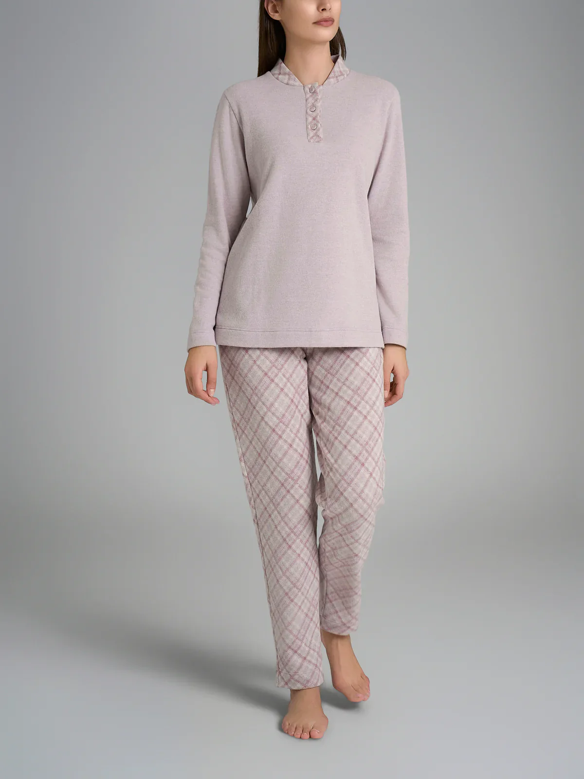Questo pigiama lungo da donna a manica lunga รจ caratterizzato dalla casacca con una bordatura alta sul collo a serafino con apertura a tre bottoni.