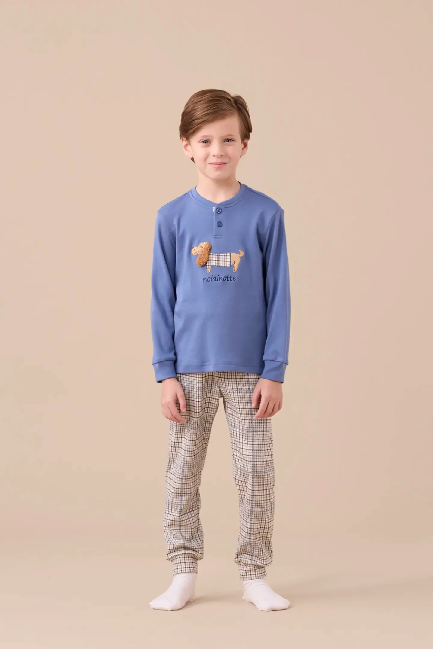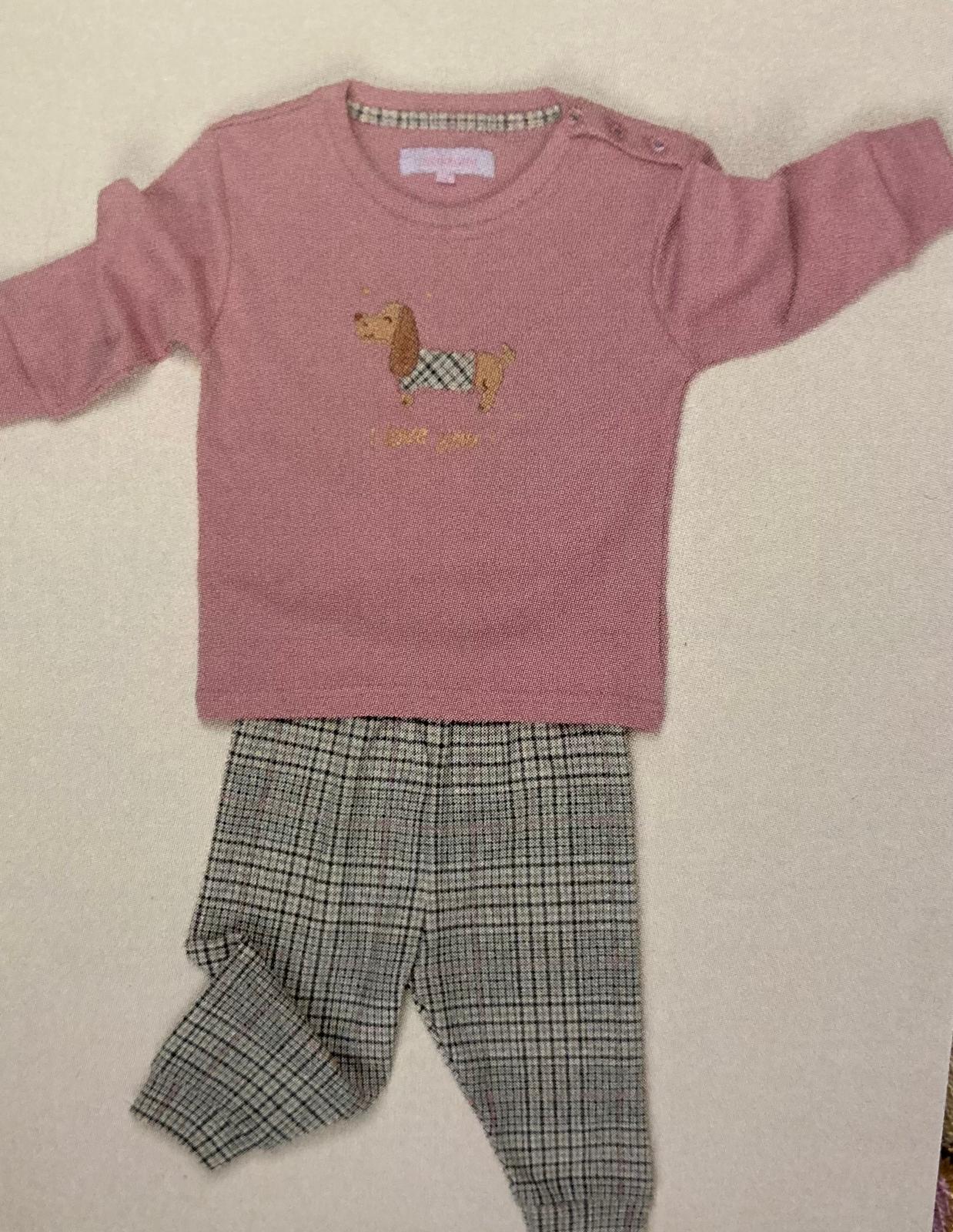 Pigiama neonato e neonata in caldo cotone, maglia in tinta unita con applicazione ricamo bassotto, pantaloni in fantasia scozzese abbinabile alla linea FAMILY FT869 FA9253 DONNA FC3136 UOMO FL516 RAGAZZO FE2534 BAMBINO-A