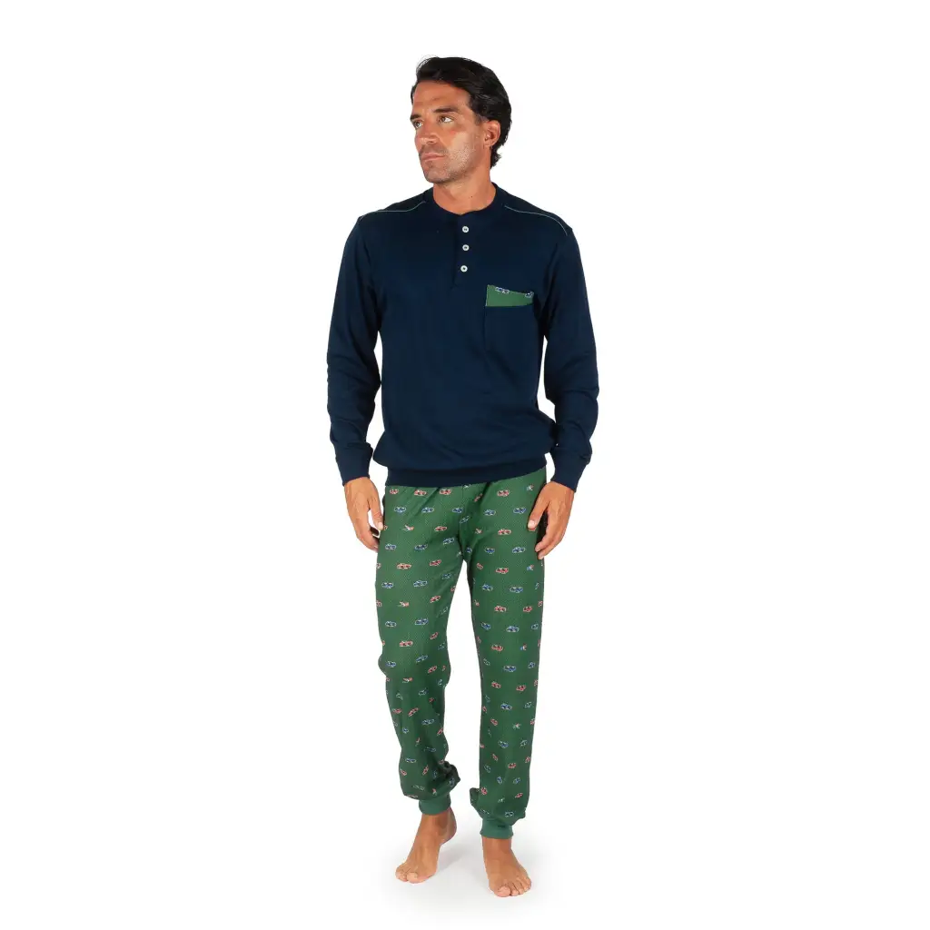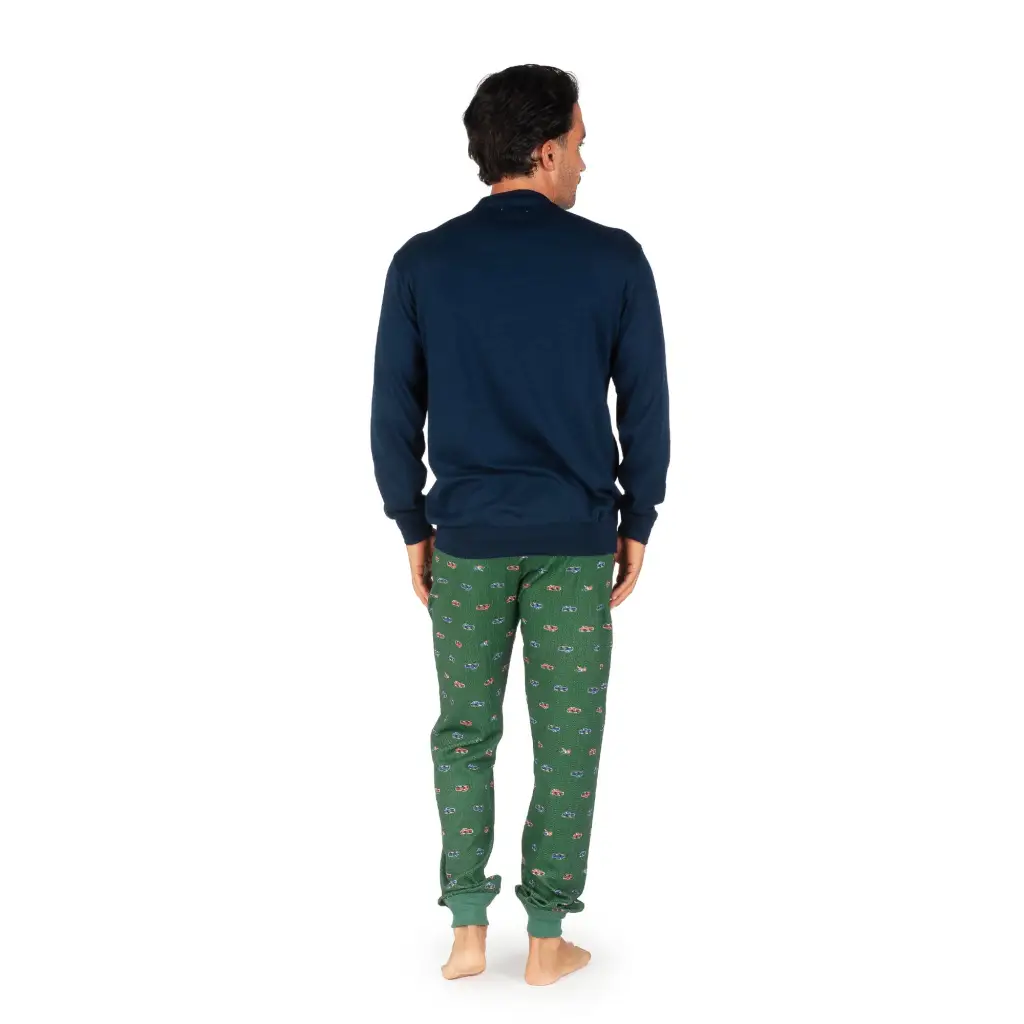 Pigiama uomo a serafino a manica lunga dritto in caldo cotone Interlock invernale di Mariotti Lab. Questo modello è interamente creato e realizzato in Italia con materie prime di pregio e filati unici per permettere un buon riposo durante la notte. Il pigiama ha una vestibilità morbida e confortevole, non aderisce troppo ma è reso sportivo e grintoso dal modello con polsino sia alla giacca che al pantalone. Il pigiama ha un design sportivo e moderno con i suoi colori brillanti ed i disegni piccoli sul pantalone che richiamano il mondo delle auto.