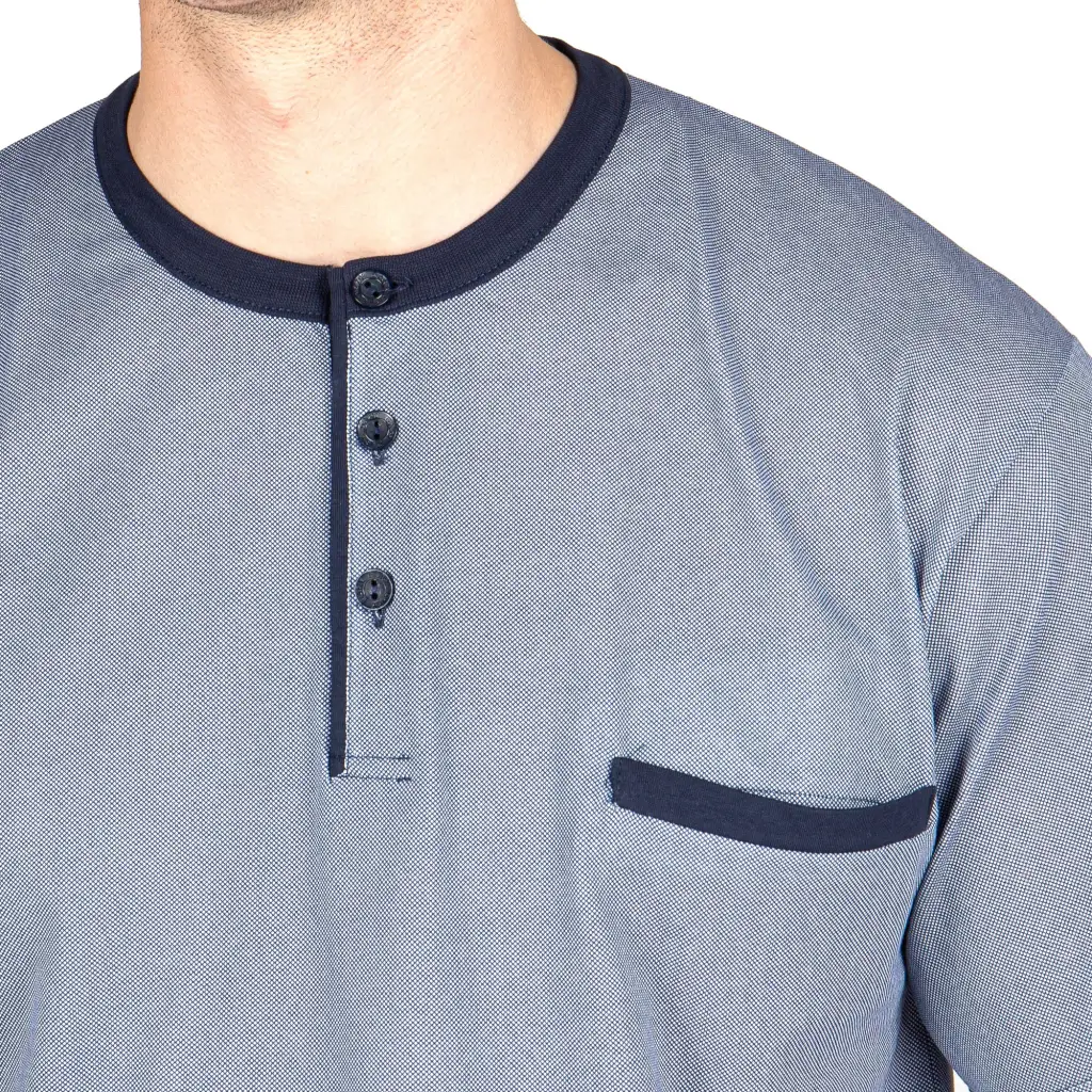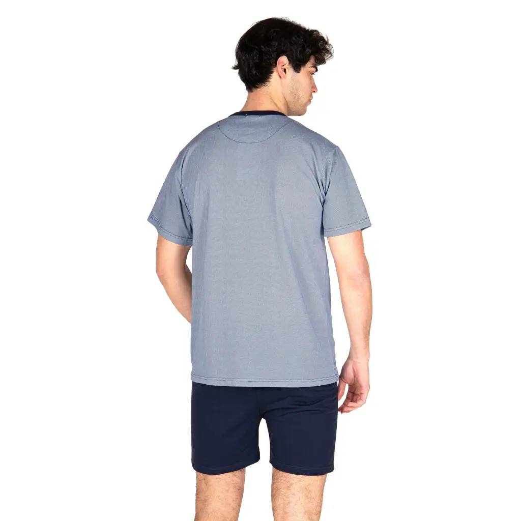Pigiama a serafino corto in freschissimo puro cotone di Mariotti Lab. Interamente Made in Italy, questo pigiama è morbido ed ha una buona vestibilità. Il design è intramontabile, con la t-shirt a serafino con taschino e realizzata in fantasia ‘Sale e Pepe’. Il pantaloncino con modello bermuda è tinta unita per dare un tocco grintoso al pigiama. – Pigiama a serafino corto- Tessuto leggero e freschissimo per l’estate- Made in Italy- Brand: MariottiLab- Riferimento articolo: LABCT603U- Composizione: 100% Cotone