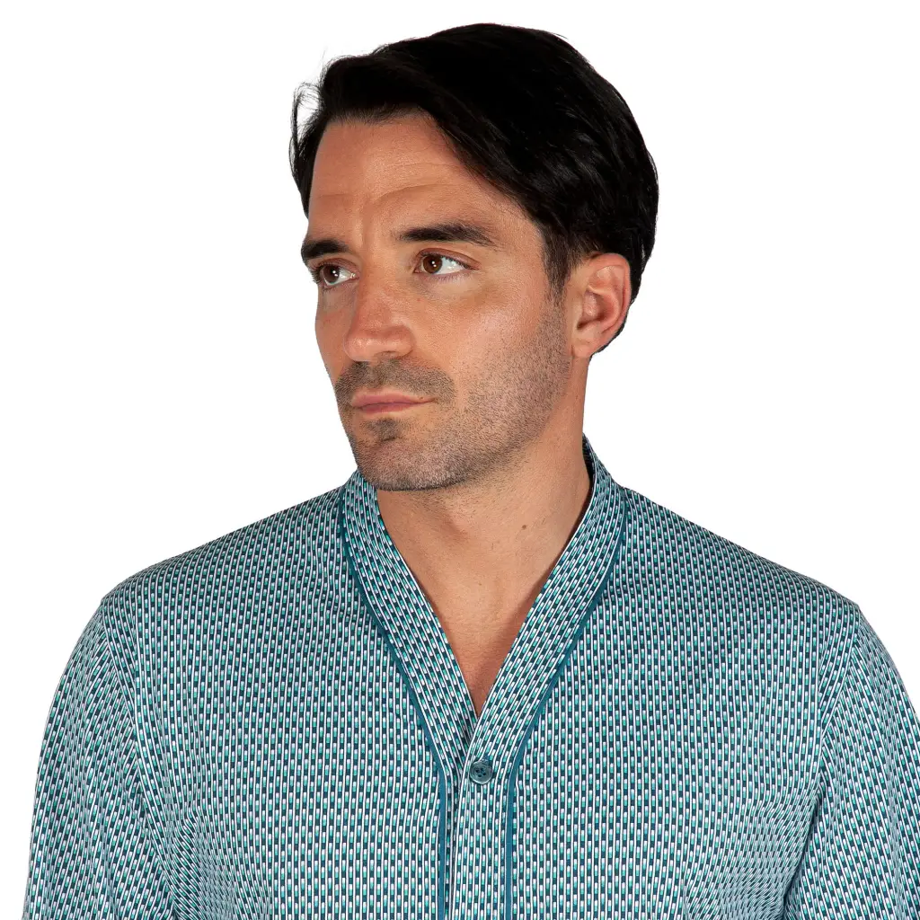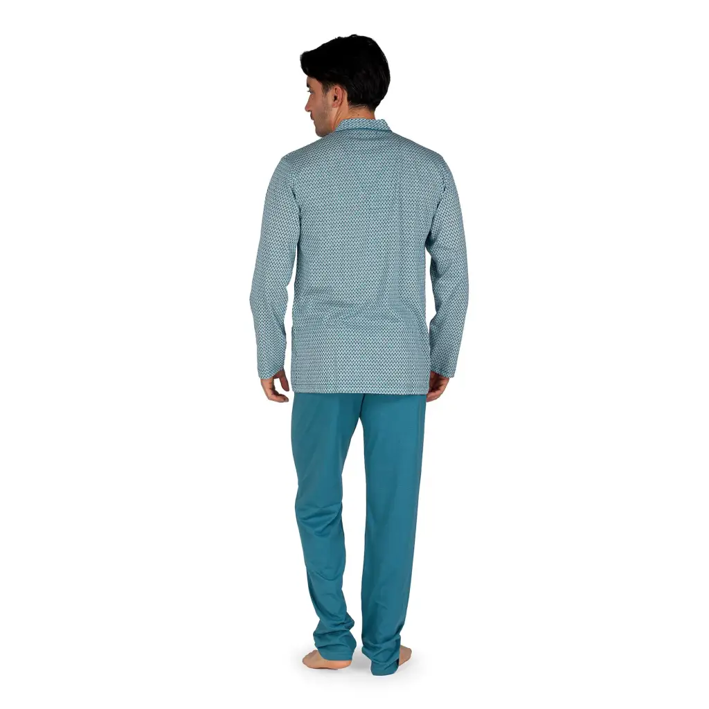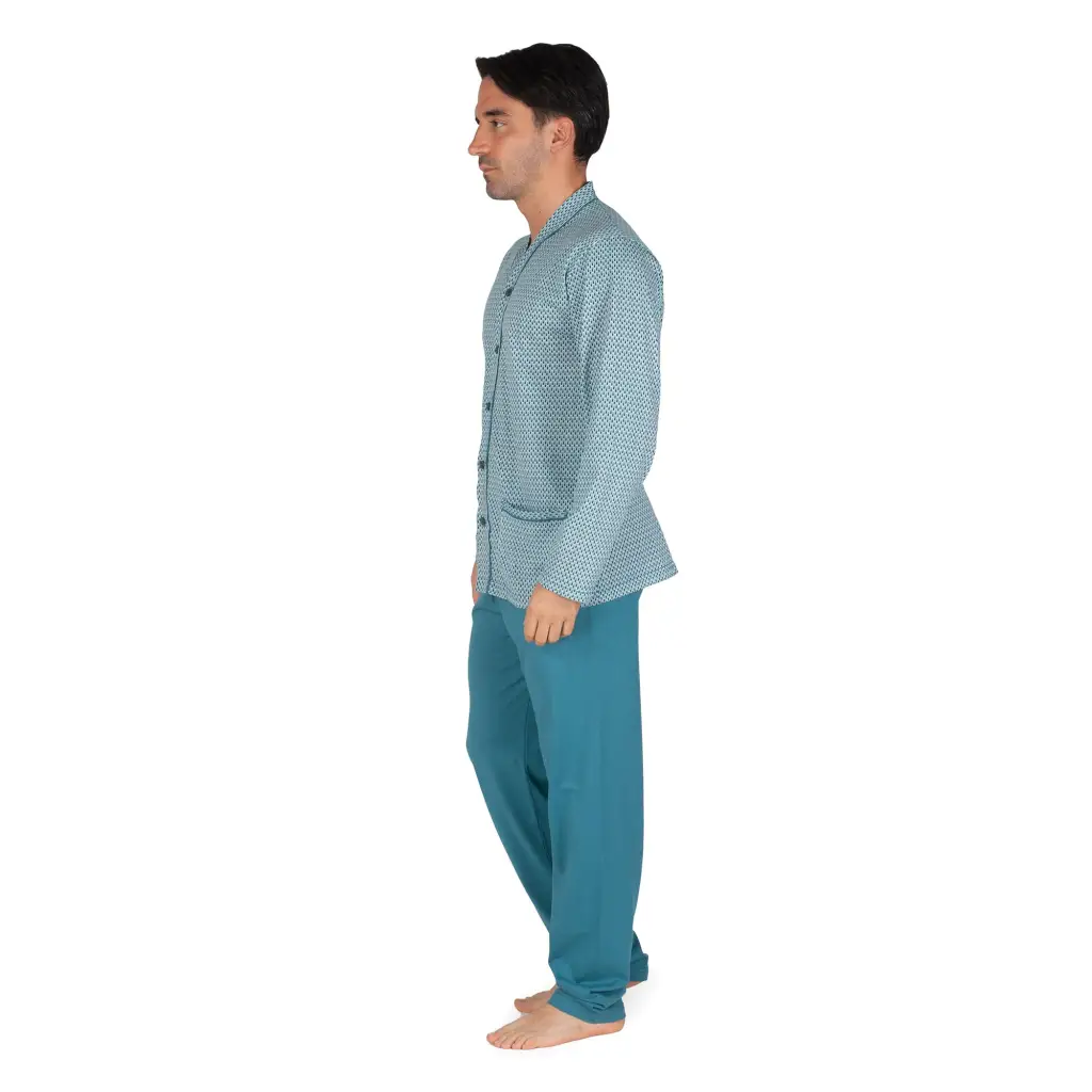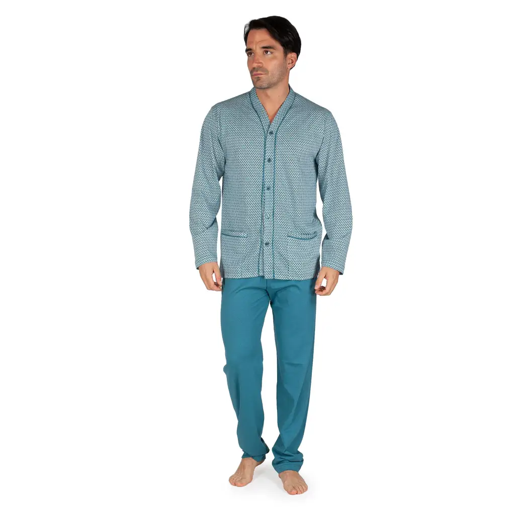 Pigiama completamente aperto davanti a manica lunga in cotone leggero della linea Mariotti Lab. Da sempre sinonimo di qualità, Mariotti Lab realizza prodotti interamente Made in Italy. Questo pigiama ha un modello assolutamente funzionale e pratico anche per un’eventuale degenza, oltre che per il quotidiano. La giacca è completamente aperta davanti, a manica lunga e con tasche sul fondo. Il pantalone è dritto alla gamba e con un morbido e sottile elastico in vita. La giacca ha una fantasia piccola ma molto colorata sui toni del verde pavone che si abbina perfettamente al pantalone a tinta unita. Il tessuto in puro cotone è molto fresco e morbido.