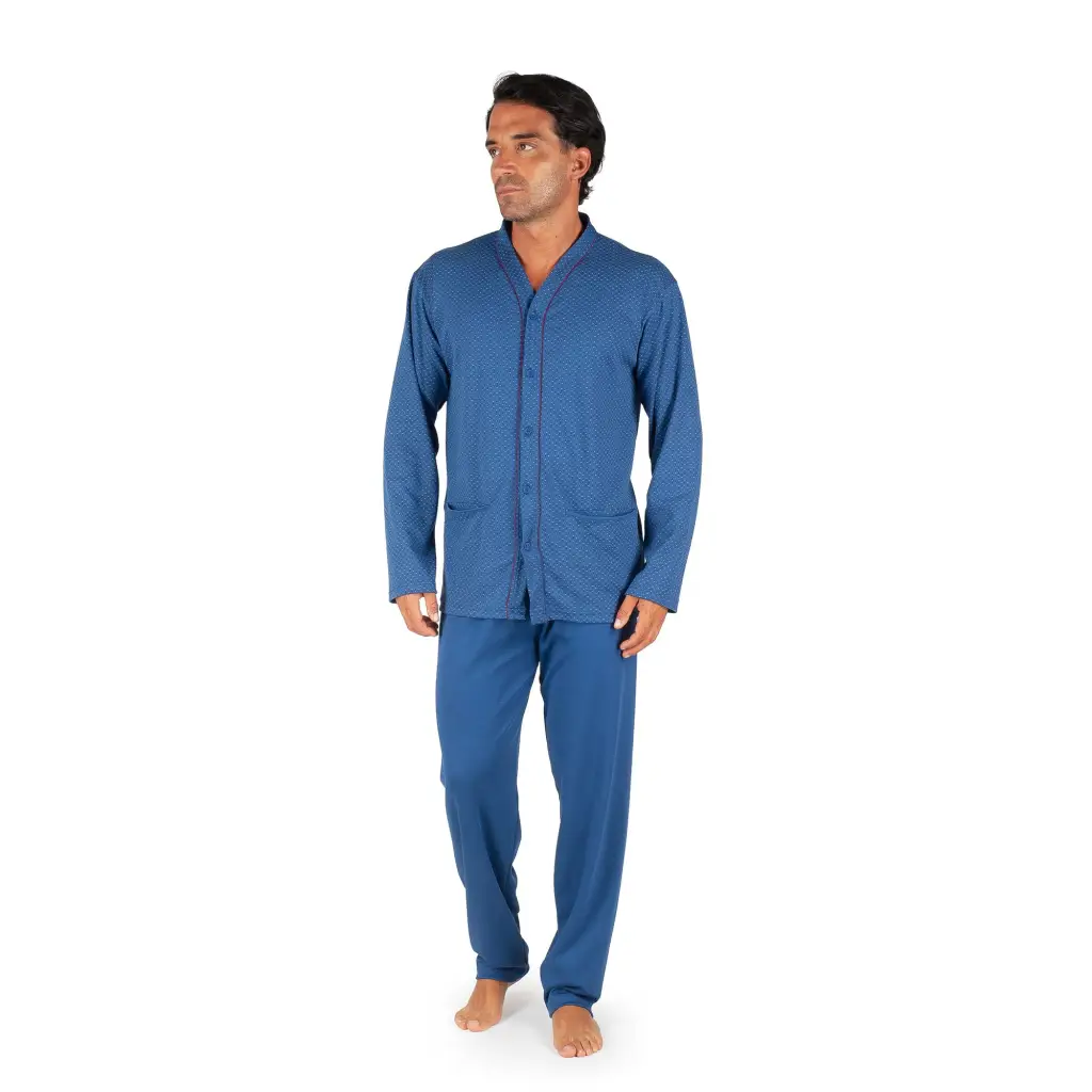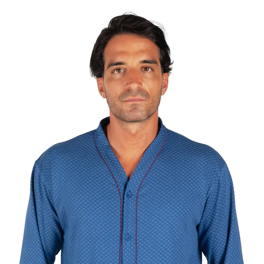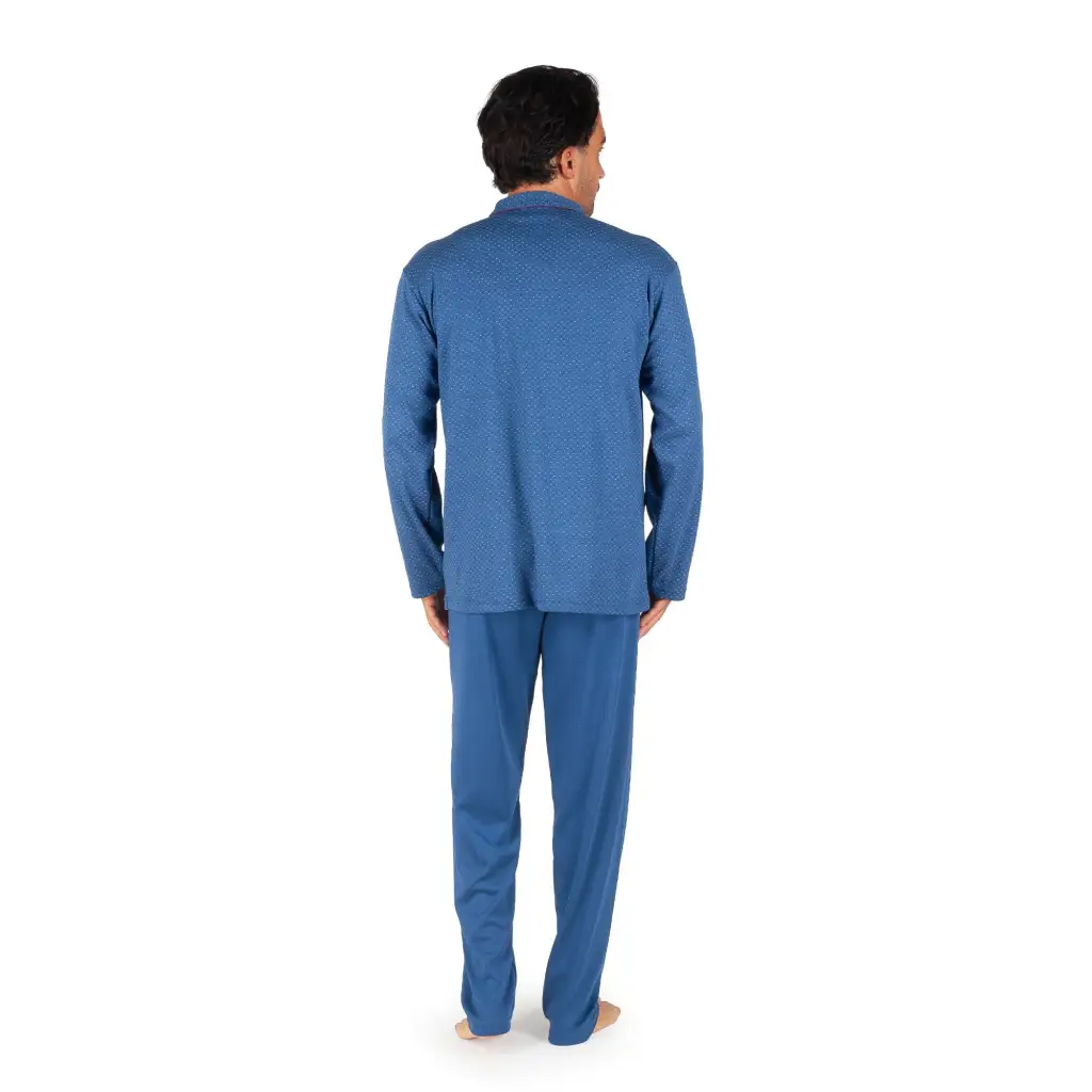 Pigiama uomo a manica lunga aperto davanti in caldo cotone interlock invernale della linea Mariotti Lab. Questo brand, da sempre attendo al confort e alla qualità dei propri prodotti, produce interamente in Italia. La giacca è realizzata con una totale apertura frontale e dotata di bottoni e scollo a cardigan che la rende elegante e pratica per agevolare l’indosso. La fantasia è caratterizzata da un elegante microdisegno su un fondo azzurro classico. Il pantalone dritto è realizzato in tinta unita in un modello morbido con elastico rivestito in vita per garantire vestibilità e comodità durante l’utilizzo.