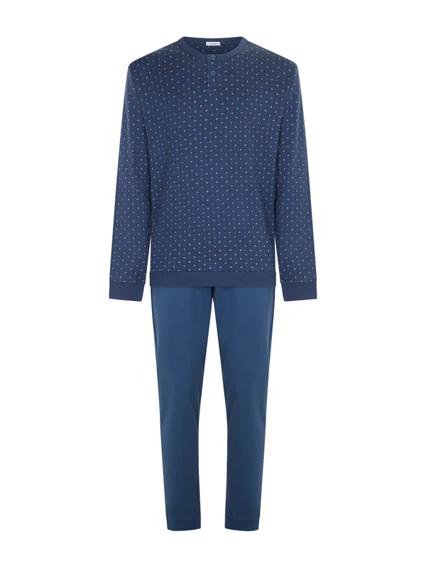 La casacca a serafino presenta una stampa cravatier, che aggiunge un tocco di eleganza e raffinatezza al capo. La fascia sul fondo e i polsini in tinta unita a contrasto completano il look con un tocco di modernitร . I pantaloni, anch’essi in tinta unita, presentano polsini alla caviglia per una vestibilitร comoda e pratica. Questo pigiama offre un mix di comfort e stile, perfetto per le serate rilassanti a casa o per una notte di sonno tranquilla. Realizzato in caldo cotone interlock, assicura una sensazione morbida e piacevole sulla pelle, garantendo un comfort ottimale.