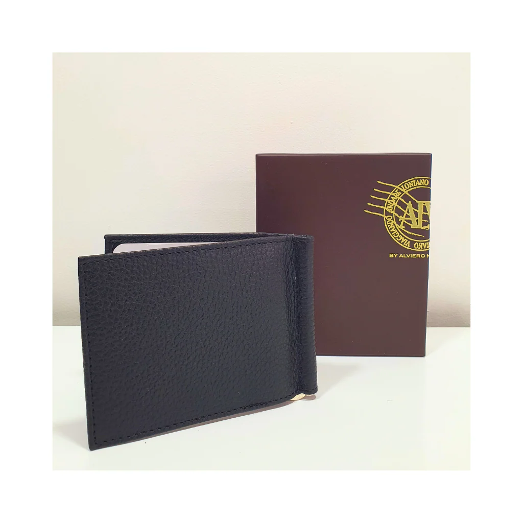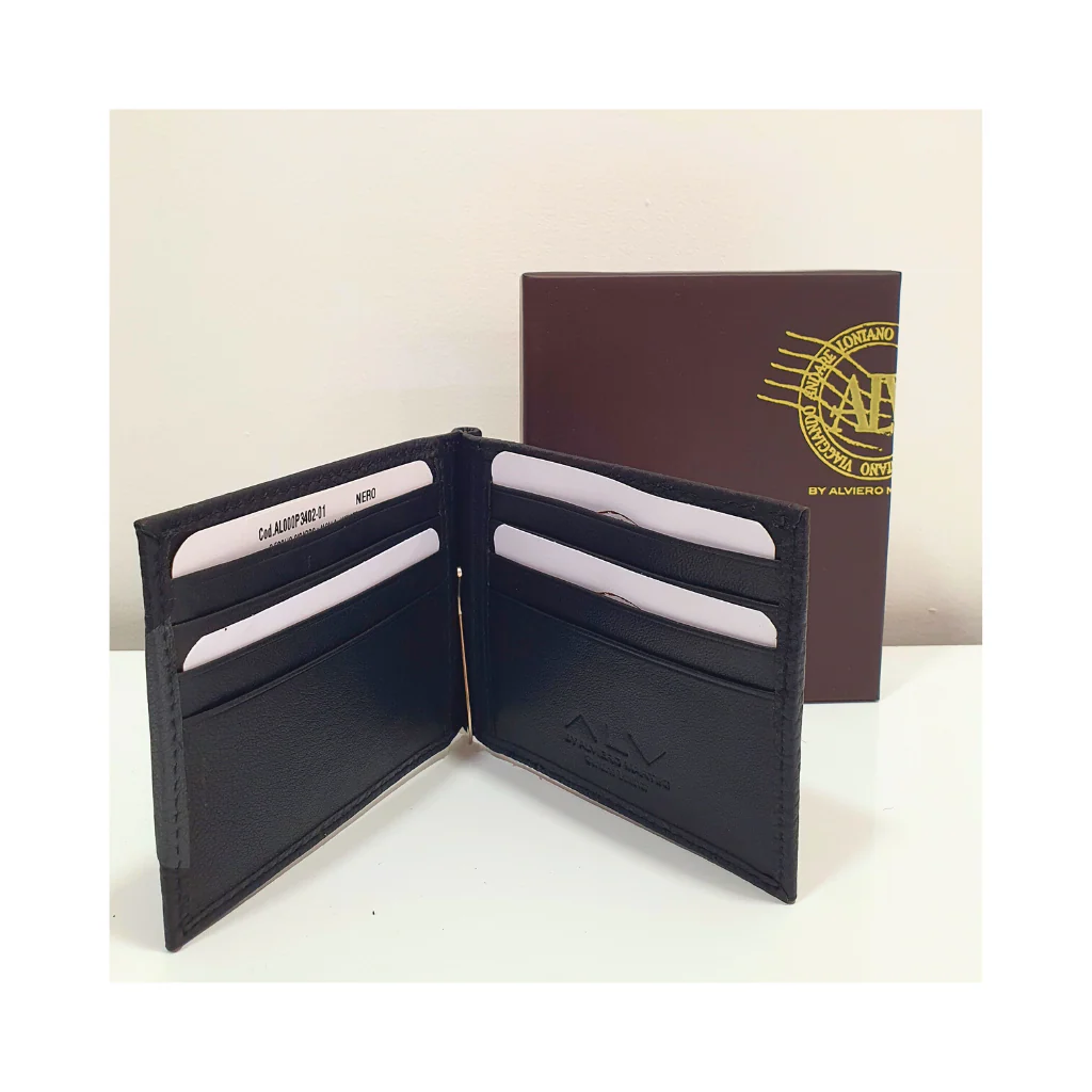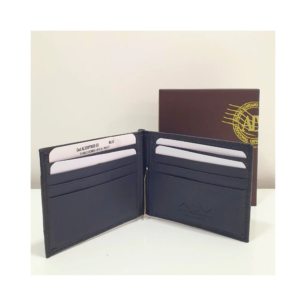 Portafoglio con ferma soldi a molla e diversi scomparti per carte di credito.