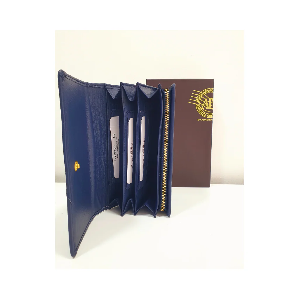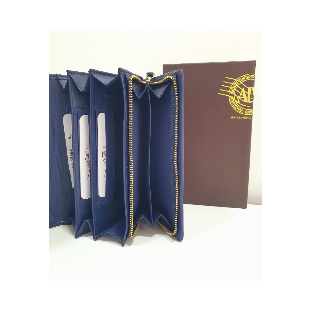 Portafoglio donna ALV con patta e zip dorata. Dimensioni: 17 cm * 10 cm. 100% Vera pelle Il portafoglio viene fornito confezionato in una elegante scatola regalo nobilitata con verniciatura parziale a rilievo del logo ALV by Alviero Martini.