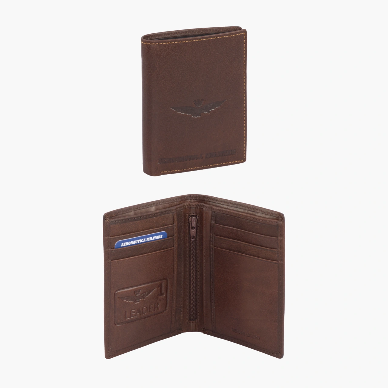 Portafoglio verticale realizzato in pelle di alta qualità con un effetto vintage, questo portafoglio Aeronautica Militare della linea New Eagle è l’accessorio ideale per chi cerca classe e praticità. Sul fronte spicca il logo alato del brand, impresso a rilievo per un tocco distintivo e raffinato.