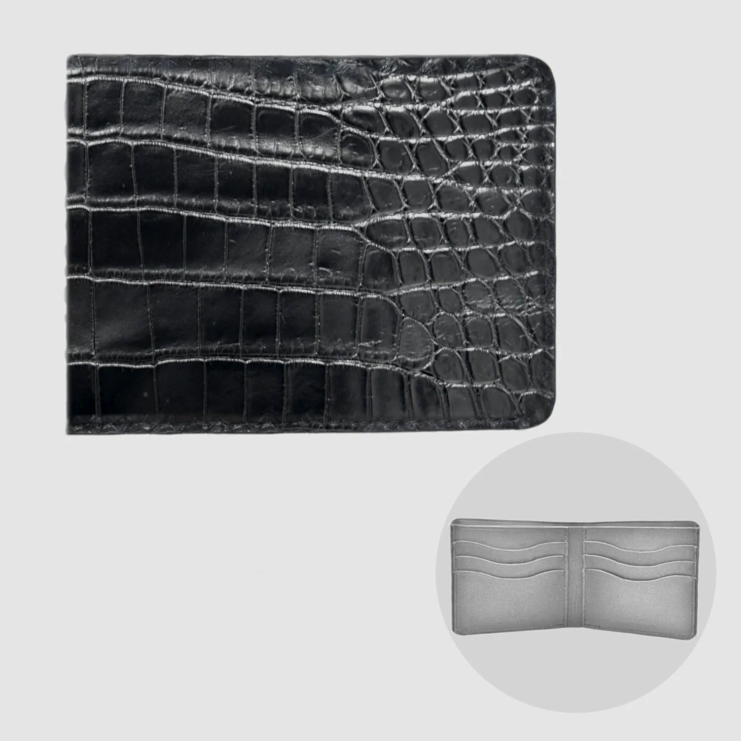 Caratteristiche Tecniche: Vero Coccodrillo Colore Nero Dimensioni: 115 x 95 x 8 (L x A x P) (in mm)