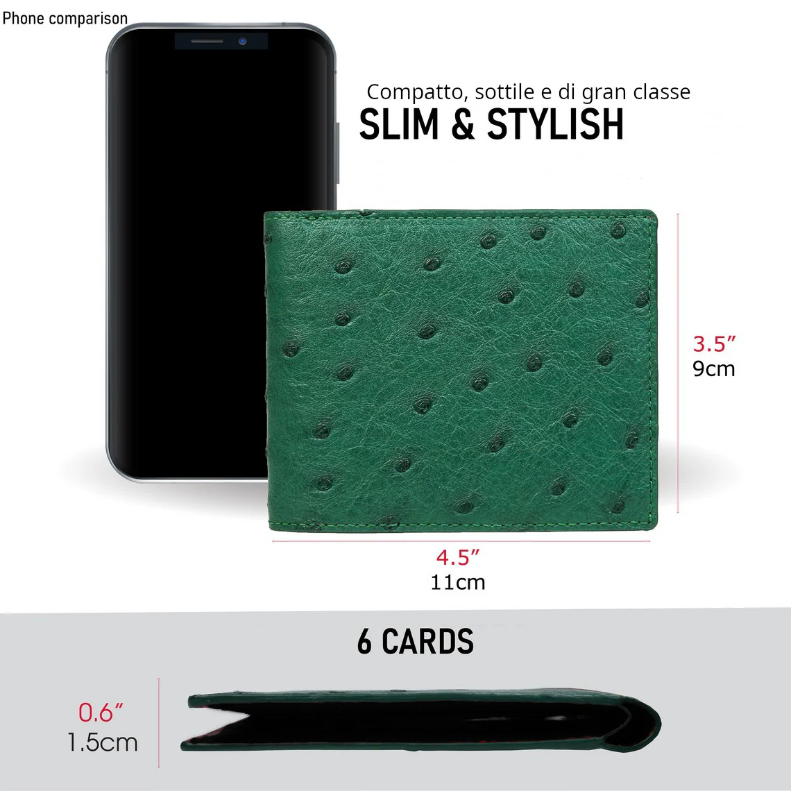 Lavorato con maestria e amore per i dettagli. Rispettando e valorizzando la bellezza e il valore dei materiali pregiati che utilizziamo. Portafoglio in Vero Struzzo verde bosco. Con sei portacarte e una tasca per i contanti. Compatto e comodo. Compagno per la vita di tutti i giorni. Personalizzabile con le proprie iniziali. In vero Struzzo per avere qualcosa di unico ed emozionante. Una creazione che si fa notare, si fa guardare come ogni prodotto Mespecta, pur rimanendo di grande raffinatezza.