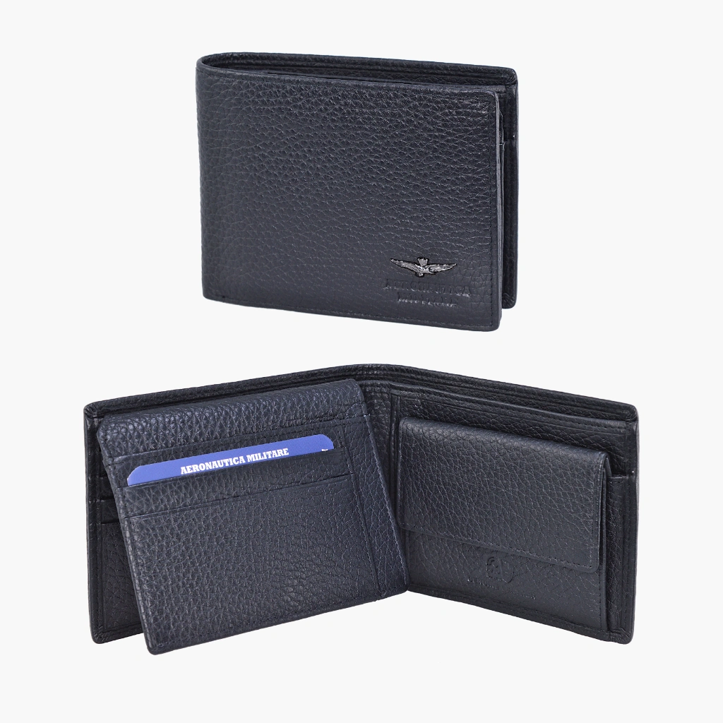 Portafoglio uomo in vera pelle morbida con patta porta documento, caratterizzato dall’aquila in metallo e marchio a fuoco Aeronautica Militare . Il particolare pellame rende il portafoglio comodo da portare in tasca, ma al tempo stesso non rinuncia alla resistenza e all’eleganza della vera pelle