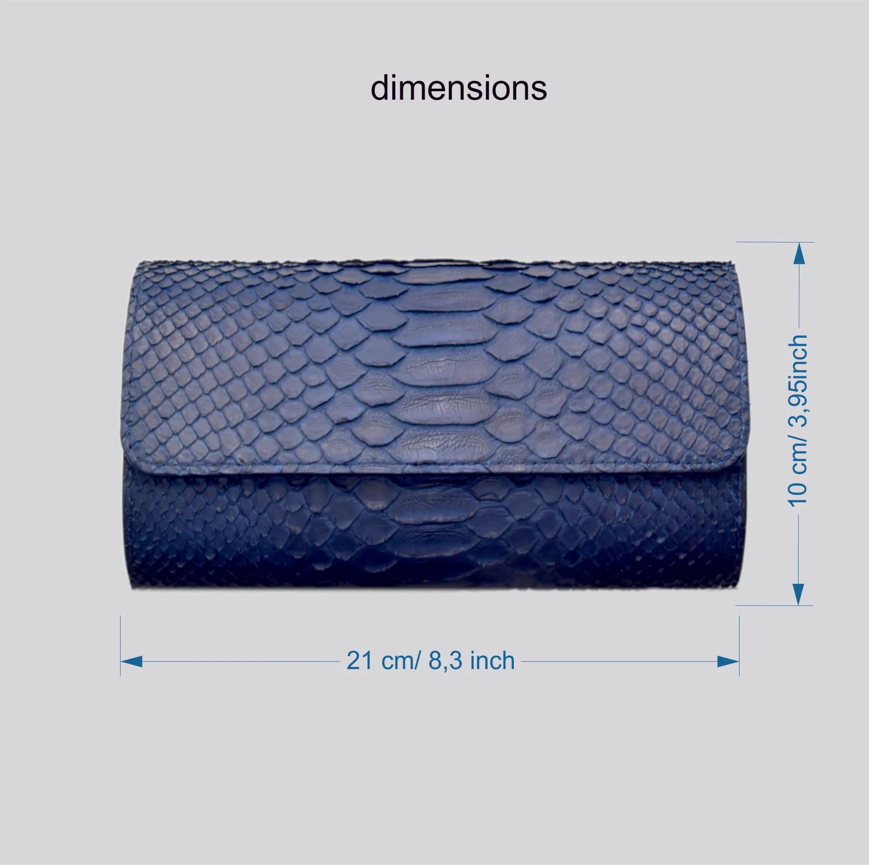 Caratteristiche Tecniche: Vero Pitone Colore – Blu Navy Grandezza – per 3 orologi Dimensioni: 10 x 21 x 6,6 (A x L x P) (in cm)