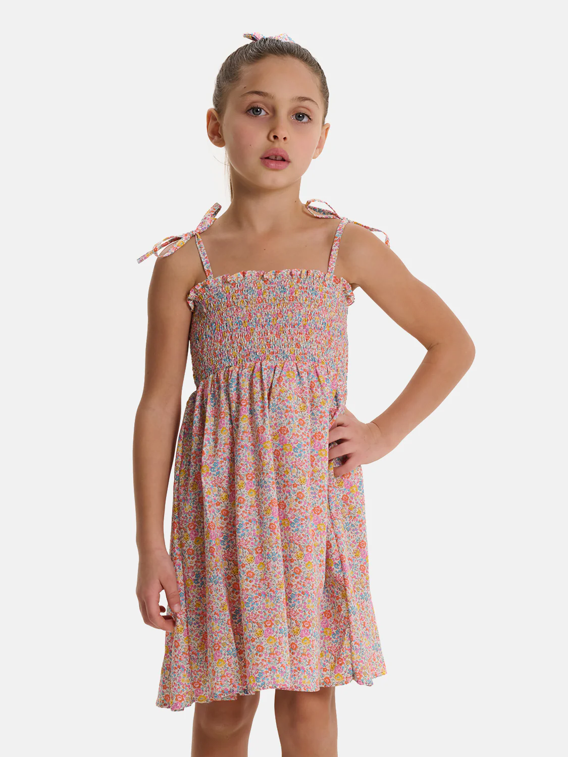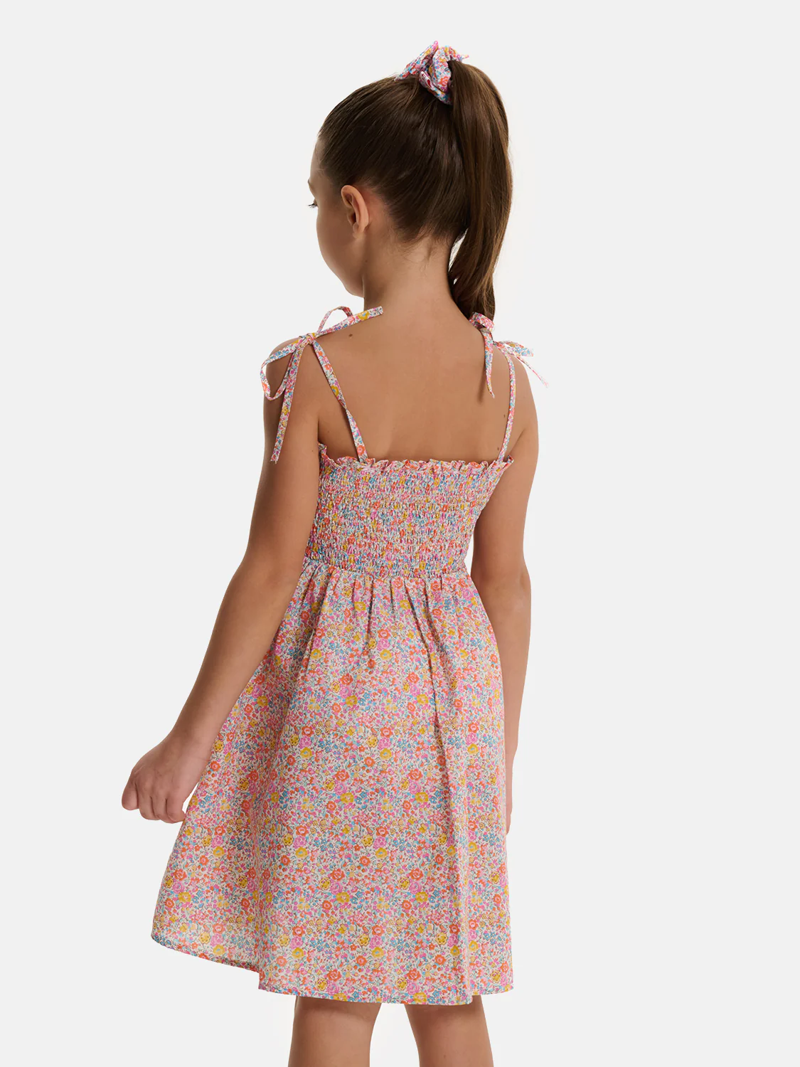 Abitino prendisole con filza elastica, bambina realizzato in 100% cotone Liberty Tana Lawn, un tessuto leggero, morbido e naturalmente traspirante, ideale per accompagnare le bambine con comfort durante tutta la giornata.