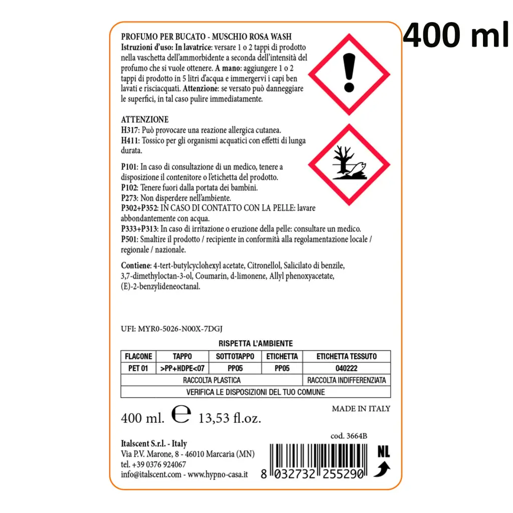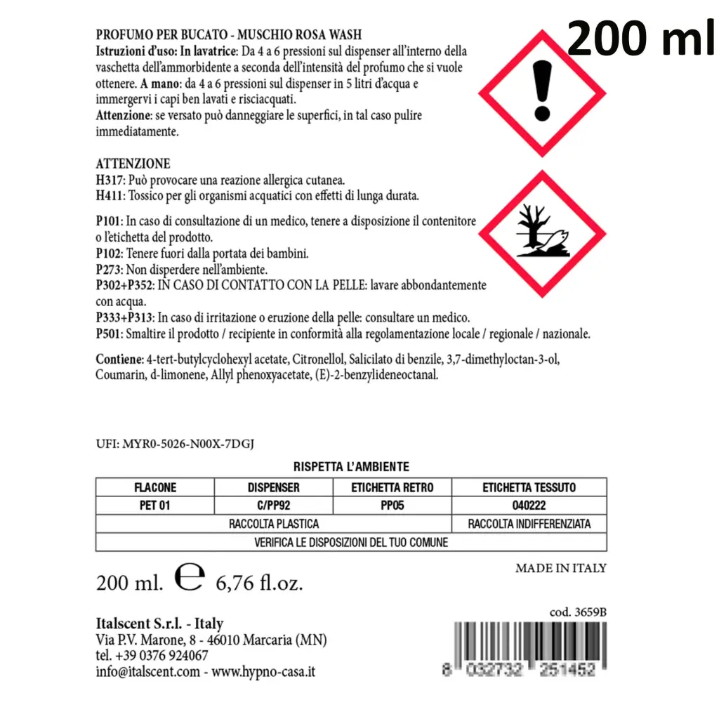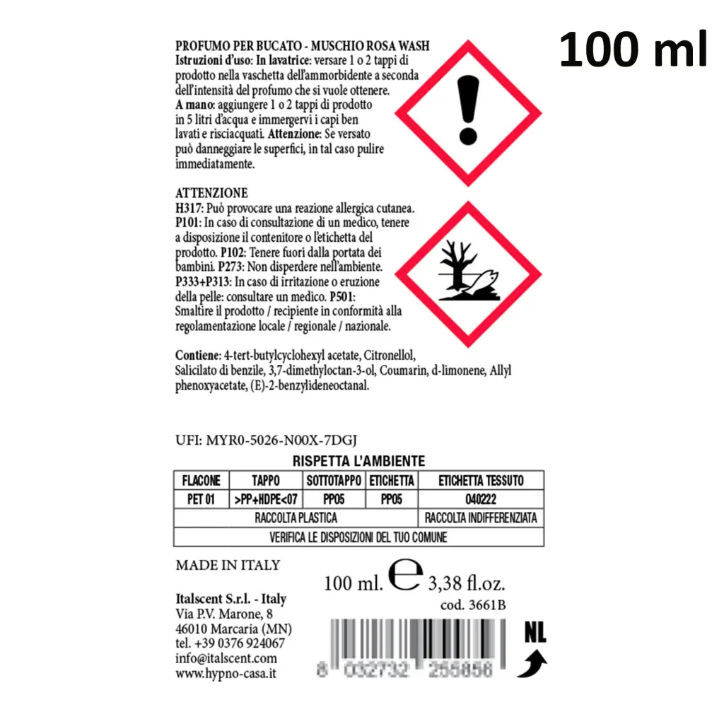 Profumatore concentrato per bucato della linea Muschio Rosa di Hypno Casa. Questo profumatore รจ ottimo per profumare il bucato, persiste per giorni, anche con l utilizzo dell asciugatrice, ed รจ delicato sui tessuti. Questi profumatori riducono il formarsi dei cattivi odori. La fragranza Muschio Rosa รจ perfetta per essere utilizzata per la biancheria da casa grazie ai sentori di Neroli e Arancio che si uniscono alle note di cuore fiorite della Rosa di Maggio e di Geranio. Il fondo legnoso รจ addolcito dalla Vaniglia e dai Muschi Bianchi. Puรฒ essere utilizzato in combinazione con l’ammorbidente neutro igienizzante di Hypno casa. Tutti i profumatori concentrati per bucato di Hypno Casa sono Made in Italy.