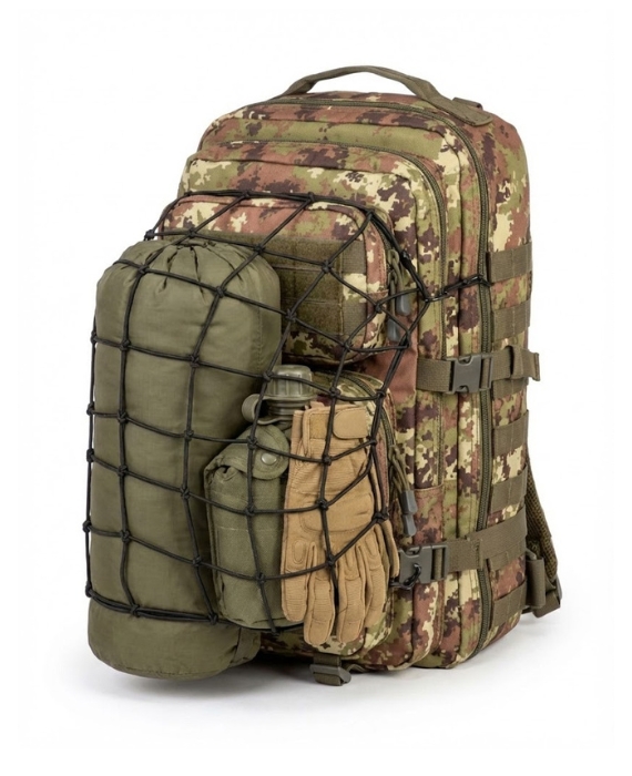 Infatti grazie alla possibilità di modulazione dei ganci, disponi gli oggetti del tuo corredo individuale in modo regolamentare allo scopo di ottenere un carico dello zaino equilibrato, uniforme, e che occupa il minore spazio possibile.