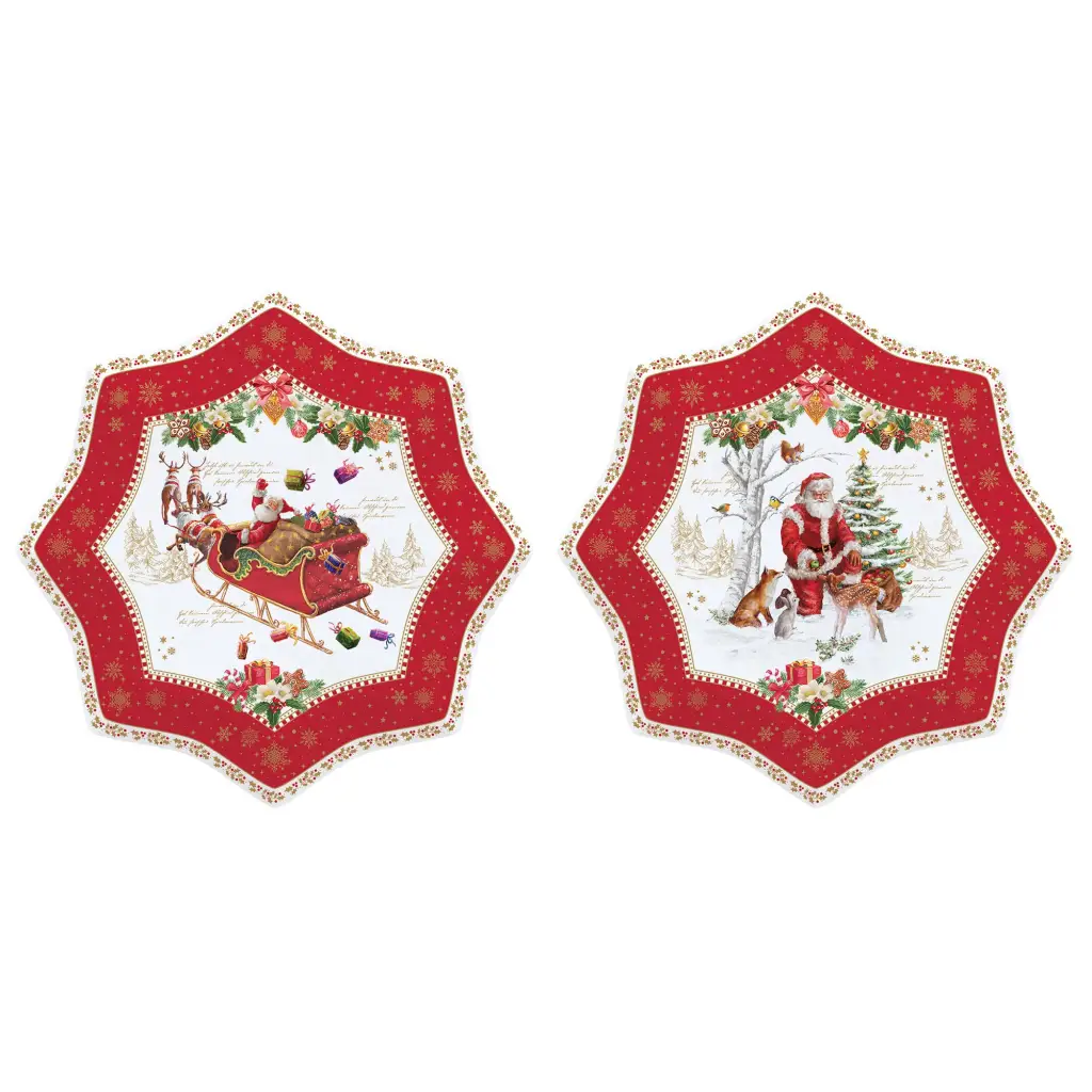 Set di 2 piattini dolce della linea Christmas Memories di Easy Life. Rendi indimenticabile il tuo pranzo natalizio con questo esclusivo set di 2 piattini dessert in porcellana, sagomati a stella di Natale. Ogni pezzo celebra la magia delle festività con affascinanti illustrazioni che ritraggono Babbo Natale sulla sua slitta e gli incantevoli animali del bosco innevato. Perfetti per presentare panettone e pandoro con eleganza e originalità, questi piattini trasformeranno il momento del dolce in un’esperienza visiva straordinaria. I tuoi ospiti rimarranno affascinati dalla cura dei dettagli e dalla qualità della porcellana. La confezione regalo coordinata lo rende un dono straordinario per chi apprezza il fascino delle tradizioni natalizie unite al buon gusto.