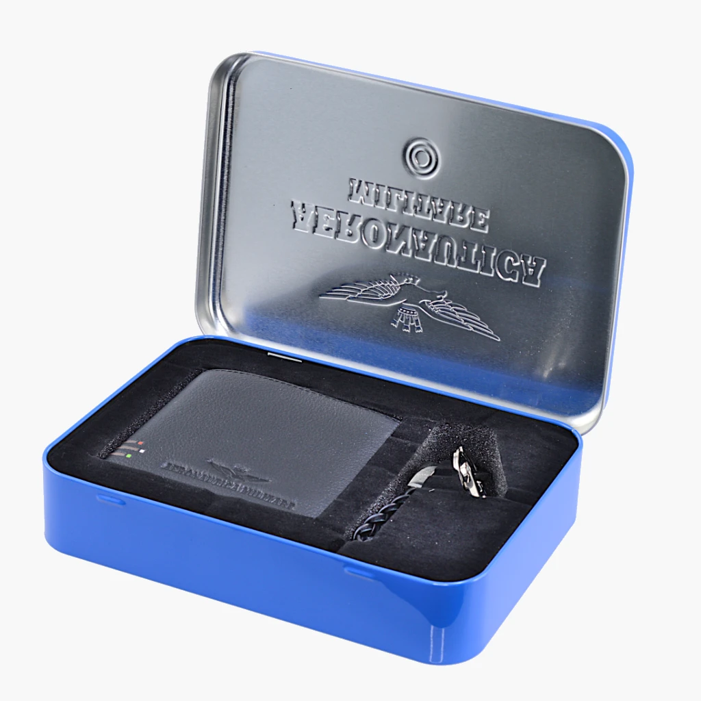 Un elegante scatola in metallo che cattura immediatamente l’attenzione grazie all’emblema distintivo dell’Aeronautica Militare.