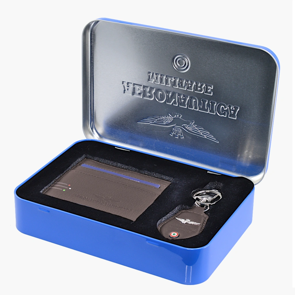 Un elegante scatola in metallo che cattura immediatamente l’attenzione grazie all’emblema distintivo dell’Aeronautica Militare.