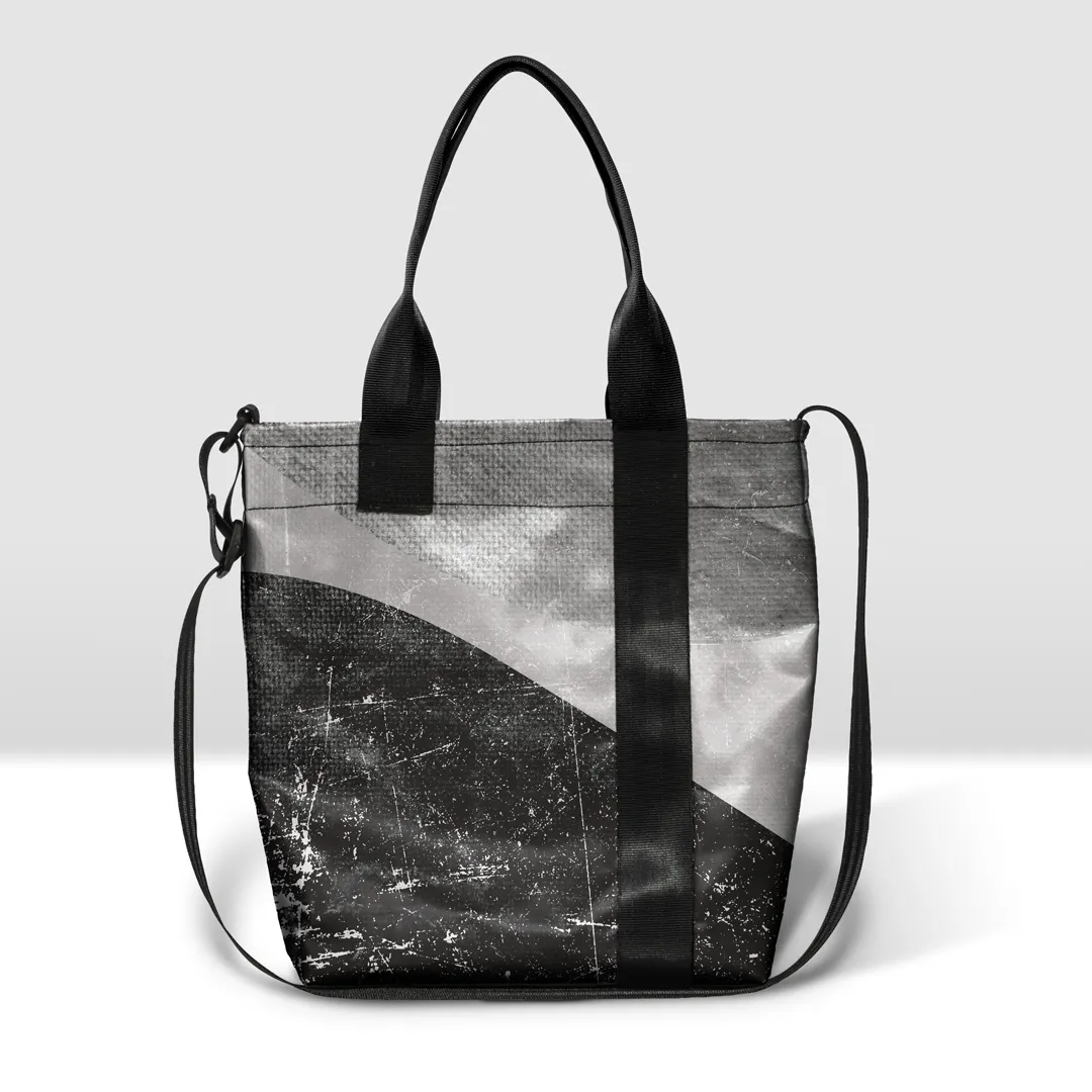 Borsa in banner PVC stampato, con zip pressofusa divisibile e tasca interna.