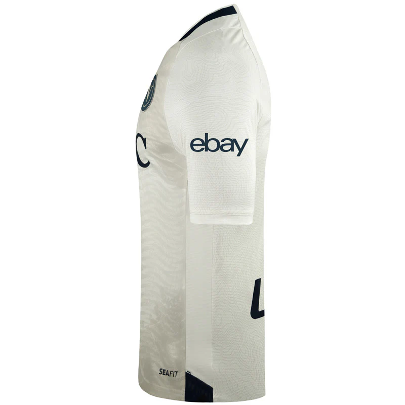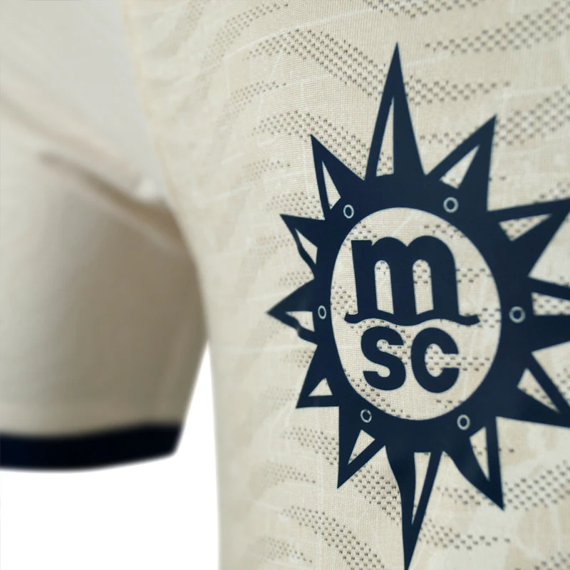 La maglia gara, color avorio, è realizzata in in poliestere bielastico con trama a onde in jacquard e stampa Mappa realizzata in sublimatico. Club crest realizzato in silicone su fondo satinato. Sponsor stampato a caldo con effetto soft-handfeel. Inserti laterali in rib di cotone a contrasto e colletto in costina completano la maglia.