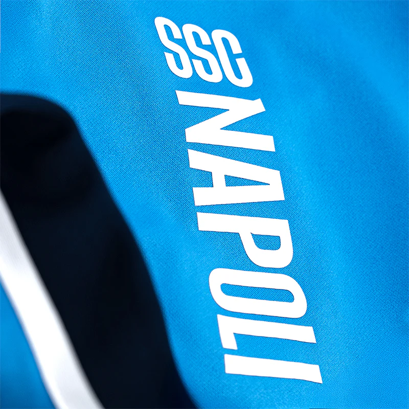 Realizzata in un azzurro intenso, simbolo indiscusso del Napoli, รจ impreziosita da bande blu scure che ne accentuano la silhouette con eleganza e sobrietร . I loghi in silicone aggiungono un tocco contemporaneo e minimale, mentre il colletto in costina di cotone richiama lโartigianalitร e la cura dei dettagli tipica della tradizione napoletana.
